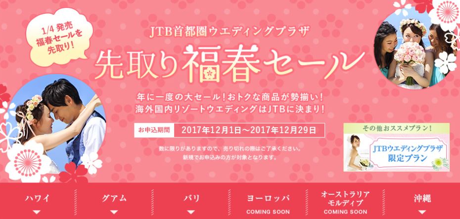 JTB首都圏(東京都品川区)は、首都圏エリアの3つのリゾートウエディング&ハネムーン専門店(銀座、新宿、横浜各本店)を含む16店舗のウエディングプラザにて、2018年1月に開催する「福春セール」に先駆け、「先取り福春セール」を12月1日から12月29日まで開催している。(詳細は紙面にて、12月21日号)