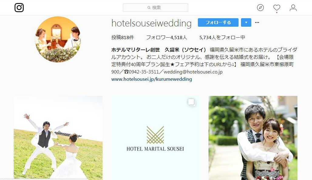 ホテルマリターレ創世久留米(福岡県久留米市)は、2015年2 月からインスタグラムを開始した。