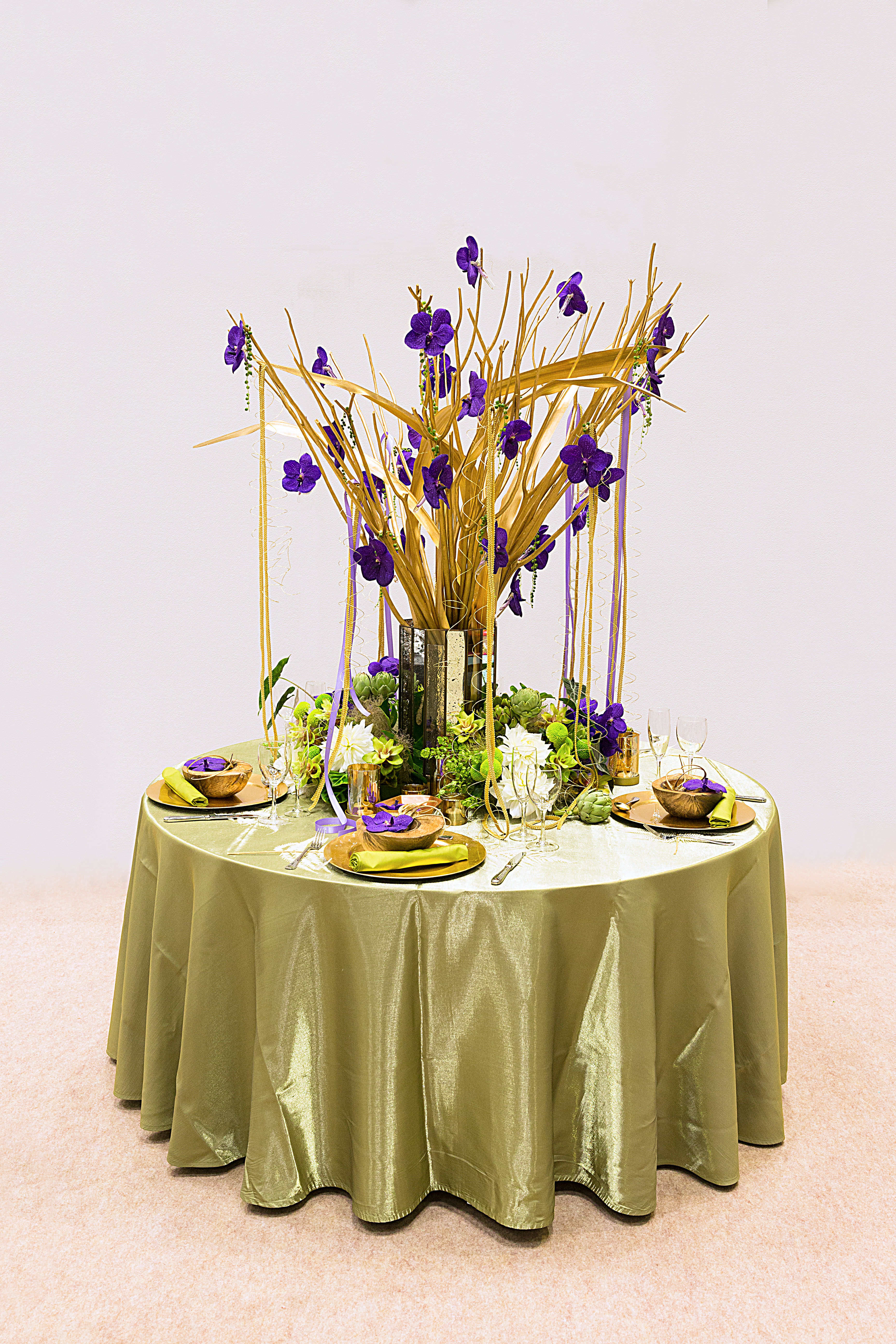“大人のパーティ”をイメージ、存在感ある木々を大胆に使用したコーディネートに仕上げました。紫の色味で、エキゾチックな空間を演出したのもポイントです。