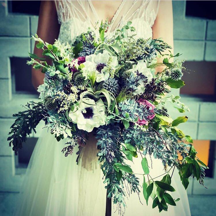 白や緑を中心としたナチュラルな組合せが多い中で、ドライフラワーやビビットな花を用いインパクトあるアレンジを展開していく。