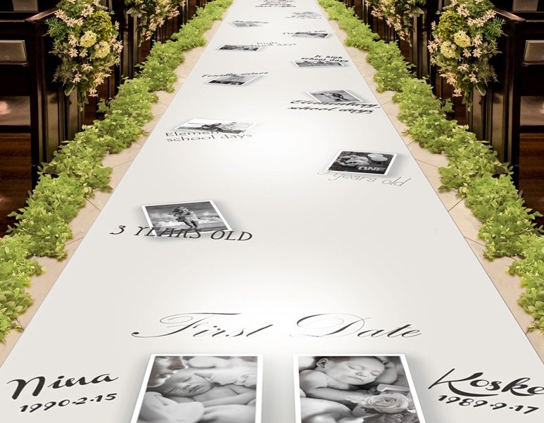演出メーカーの明来エンタープライズ(大阪市北区)は、挙式用演出商品「ヒストリーバージンロード」を販売している。新郎新婦の思い出の写真をバージンロードにプリントするもので、大手婚礼施設でも導入されている注目商品だ。