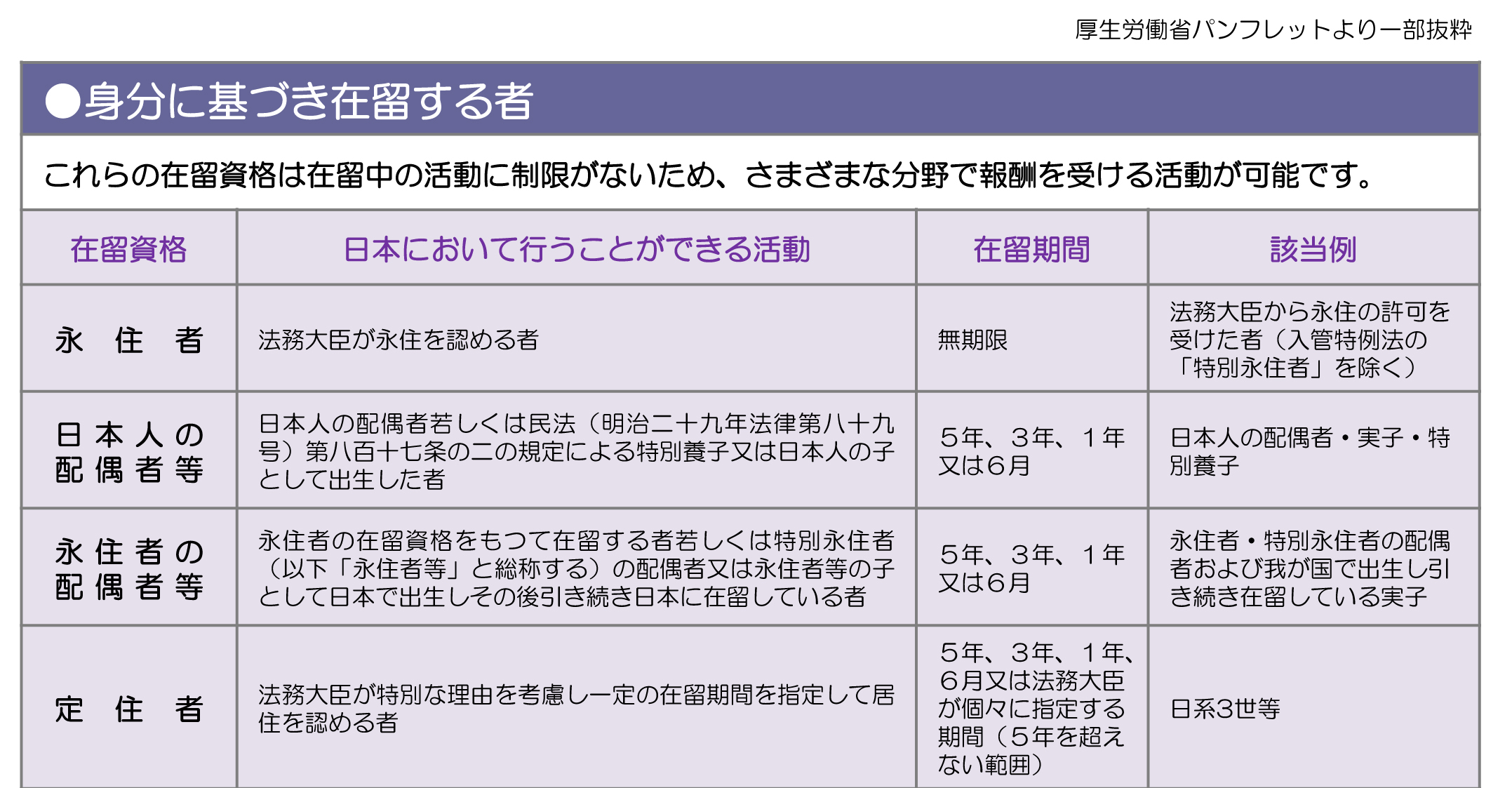 では、今号の本題の就労制限がなく働ける在留資格に関して説明していきましょう。「就労制限のないビザ」とは、いわゆる身分系のビザを持つ外国人を指します。身分系のビザとは、「永住者」、「日本人の配偶者等」、「永住者の配偶者等」、「定住者」の在留資格を持つ方です。また、在留資格ではありませんが、帰化した方は日本人になりますので、もちろん就労に制限はありません。