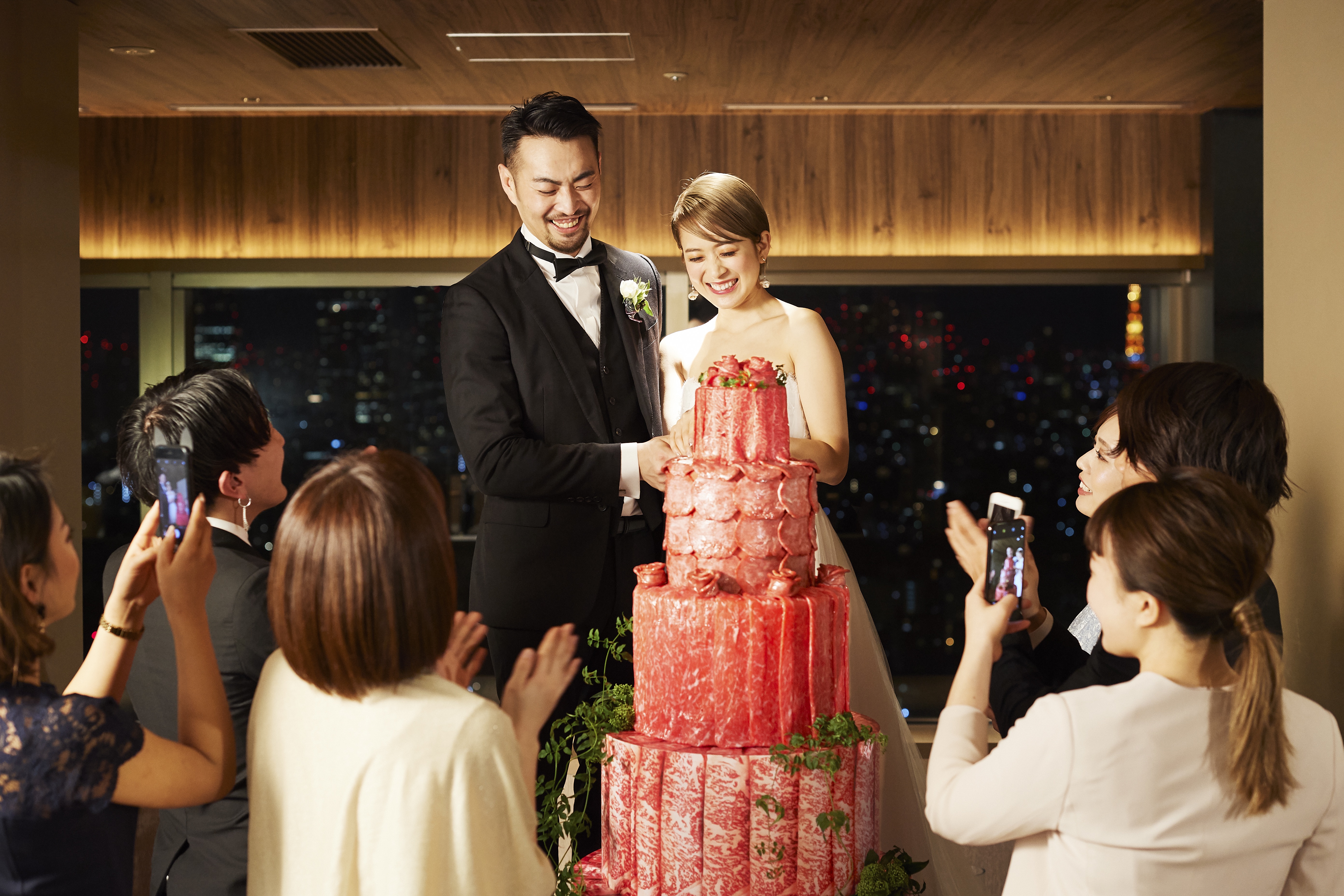 プランの目玉は、高さ1.8メートルのお肉のウエディングケーキ入刀。最上段はA4ランク以上の和牛肉を使用している。生食加工をしているため、そのままファーストバイトで食べることも、シェフが焼いて提供することも可能だ。2~3段目は食品サンプル、4 段目以下は印刷したフェイクを使用している。
