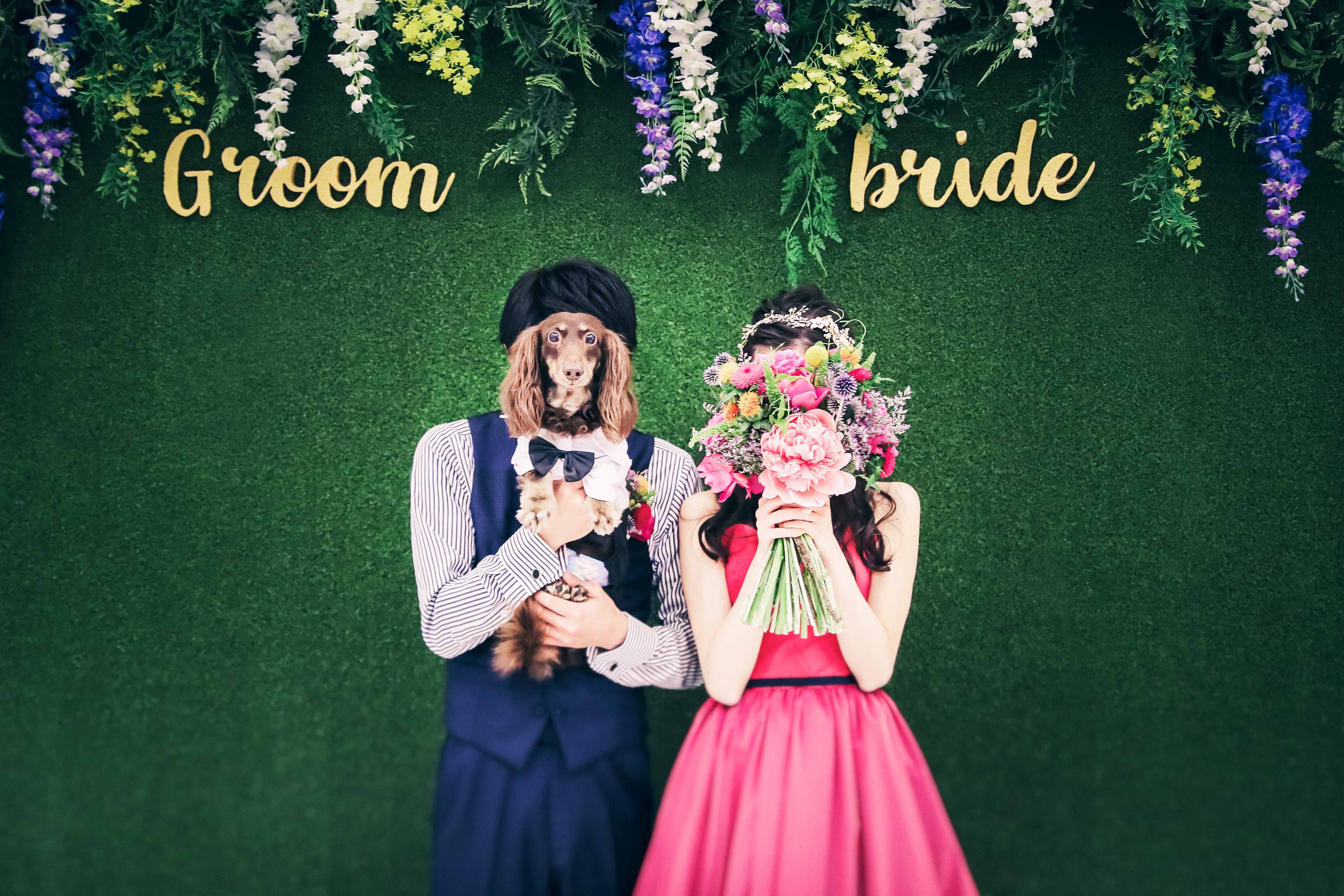 愛犬も参加してのフォト。ドレスのカラーもあり、アーティスティックなショットになりました。新郎新婦の顔は犬とブーケで隠れているものの、裏でいたずらに笑う2人の表情がイメージできます(笑)