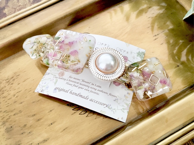 百貨店での催事も行っている。すぐに完売してしまう人気商品は、ドライフラワーを樹脂で固め、ボタニカルパーツをバレッタの金具に付けたヘアアクセサリー。