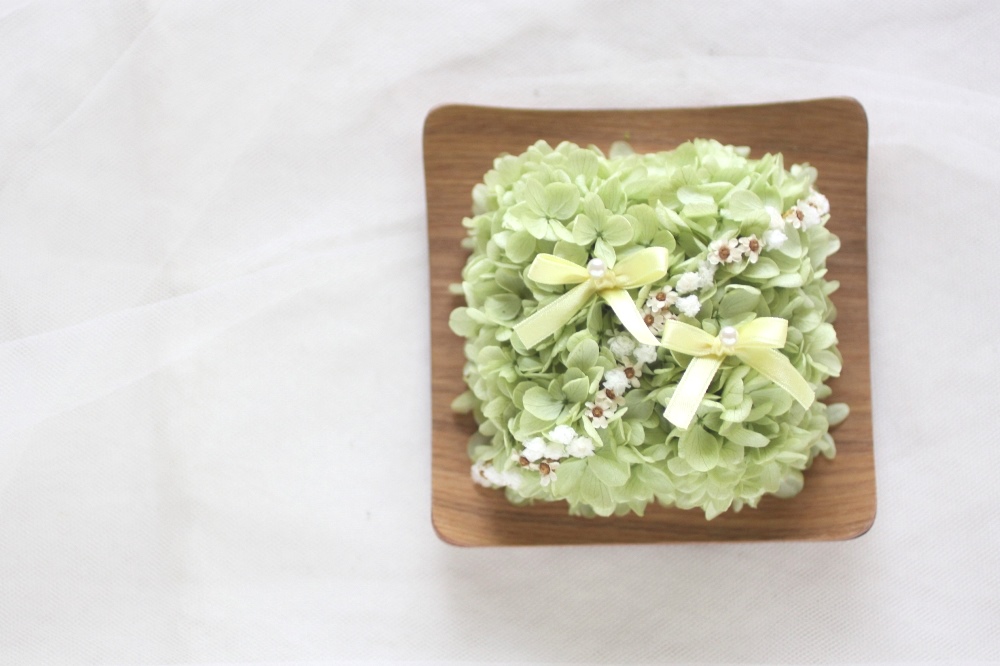 13cmの四角い木の器にプリザーブドフラワーの紫陽花を盛り付け、ドライのミニデイジーとプリザーブドのかすみ草で白いラインを作りアクセントに。リボンが結ばれたピンに、リングを設置する。