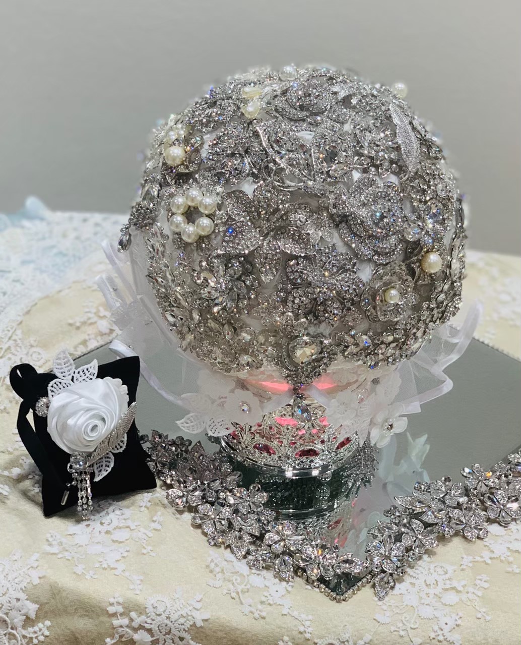 「友人夫婦が挙式で使用しました。全てシルバーのビーズでデコレーションしたので、印象が重すぎないようにレースやパールなど異素材を合わせました。」