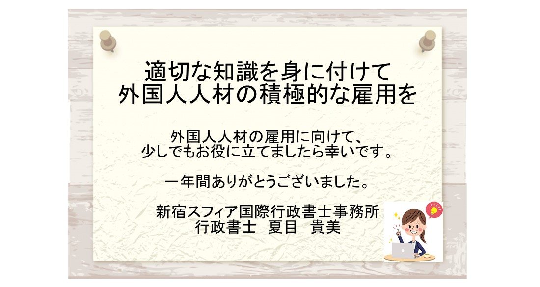 1年間を通して色々な情報をお伝えしてきましたが、お役に立ちましたでしょうか。適切な知識を身に付けて、ぜひ積極的に外国人人材を活用してもらえればと思います。1年間、本当にありがとうございました。