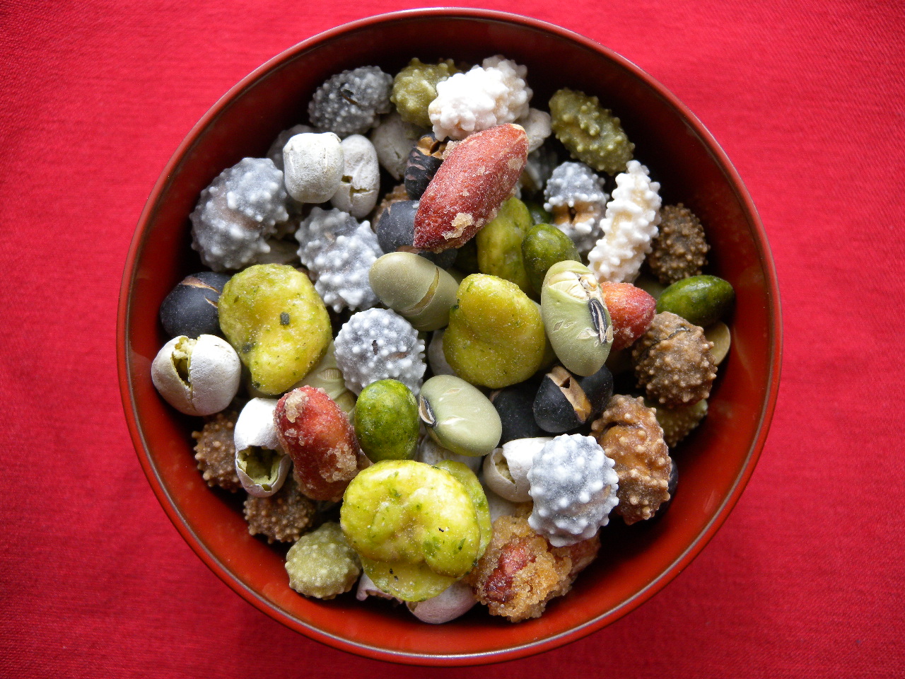 複数の豆菓子を入れている。塩辛いかぼちゃの種おかきや、甘みのある白糖落花生などを選定している。
