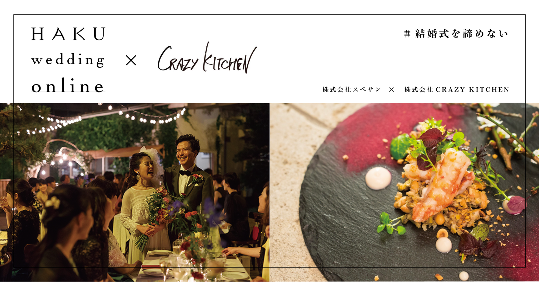ケータリングサービスを展開するCRAZY KITCHEN(東京都品川区)は、ウエディングプロデュースのスペサンとの提携を発表。『HAKU wedding online』において離れた場所でも同じ食事を楽しめるよう、5月24日から食事の配送を開始した。