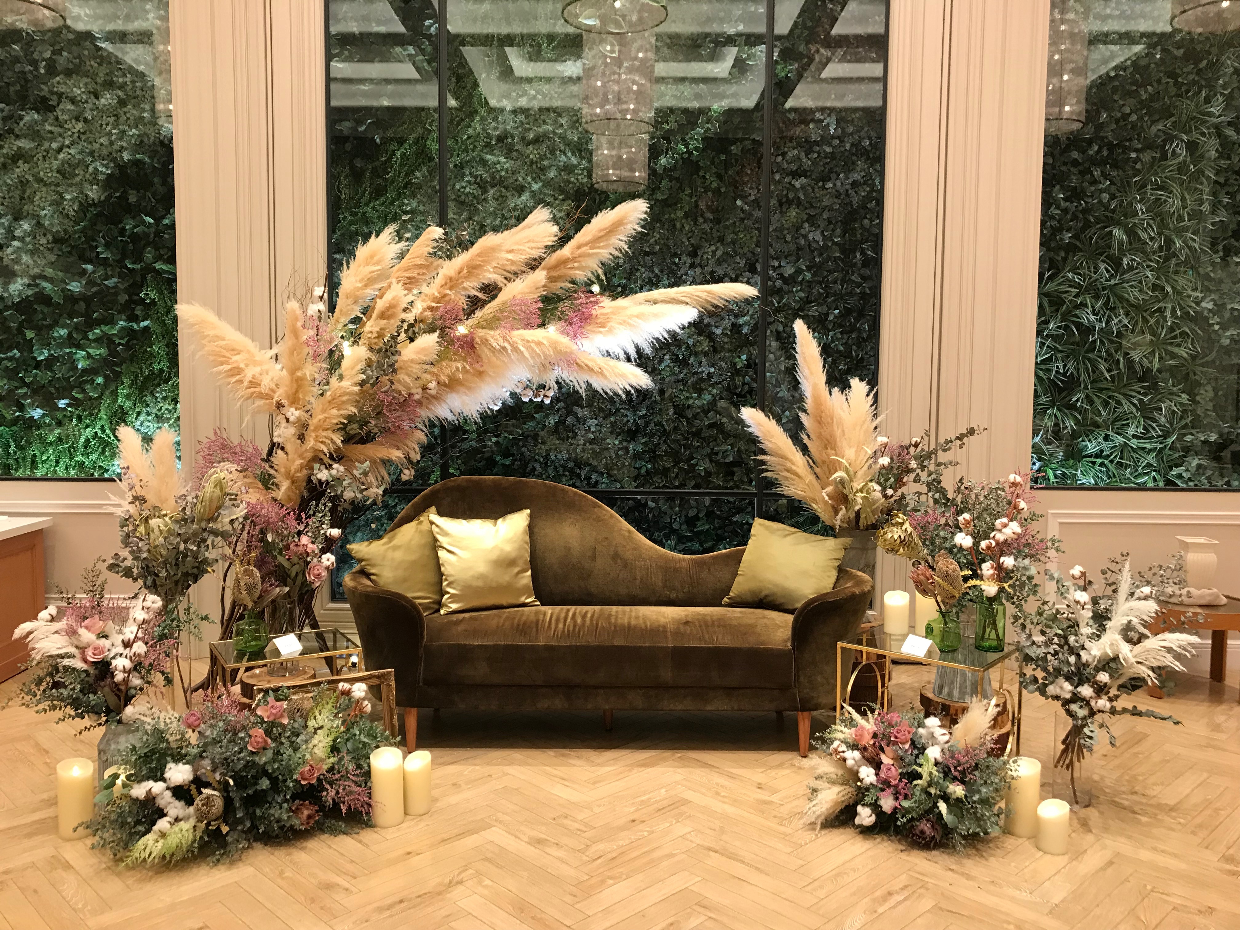 「社内ではスタッフ同士、業務日報やハマっていることを常に共有しています。中途入社のスタッフにも動画での紹介をお願いしています。個人だけでなく、各事業所全体でのコミュニケーションも活発で、その会話が商品開発に至ったことも。一つの例がアイテムはタンポポの綿毛のドライフラワー。初めはあるスタッフからの『ドライフラワーに挑戦しています!』という一言。可愛らしいものでしたから次々と他の社員にも広まり、『こうしてみたらうまくいった』、『色を付けてみました!』など、どんどんアイデアが出始めたのです。最終的には商品として良いものが出来上がり、ショップで販売を開始しました。普段から現場で『こうしたほうが面白いのでは』と、自分たちの知恵を絞り、アンティーク調の椅子を手作りで制作し、カンナ屑を使った敷物を創ったり。今後も一人一人の個性を生かしながら、結婚式や2人の人生に彩りを加える存在として力を発揮していきます。」