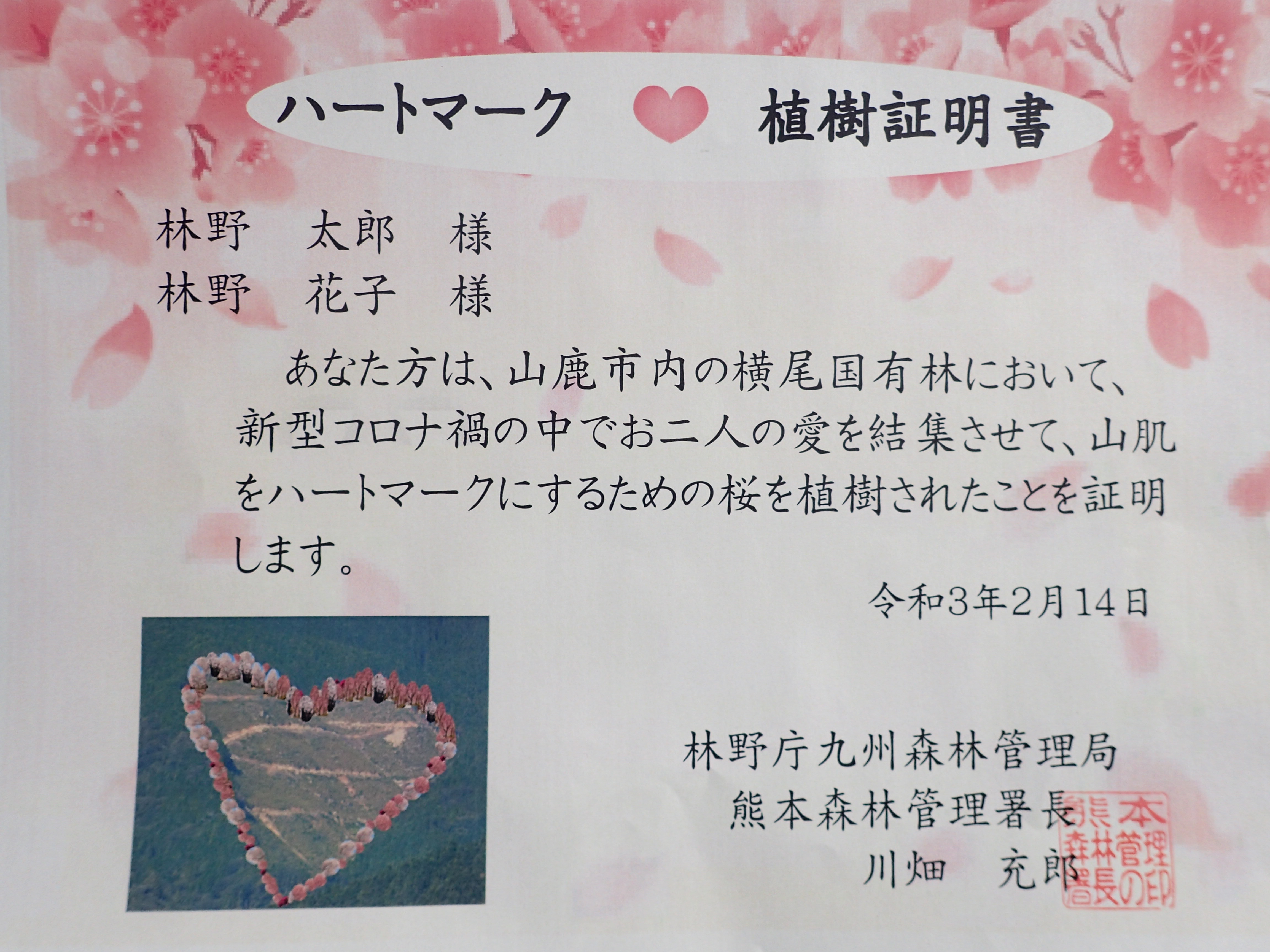 熊本森林管理署(熊本県菊池市)は2月14日、コロナ禍で結婚式が出来なかった夫婦を対象に、桜の木をハートの形に植樹するイベントを実施した。当日は31組の夫婦が参加した。