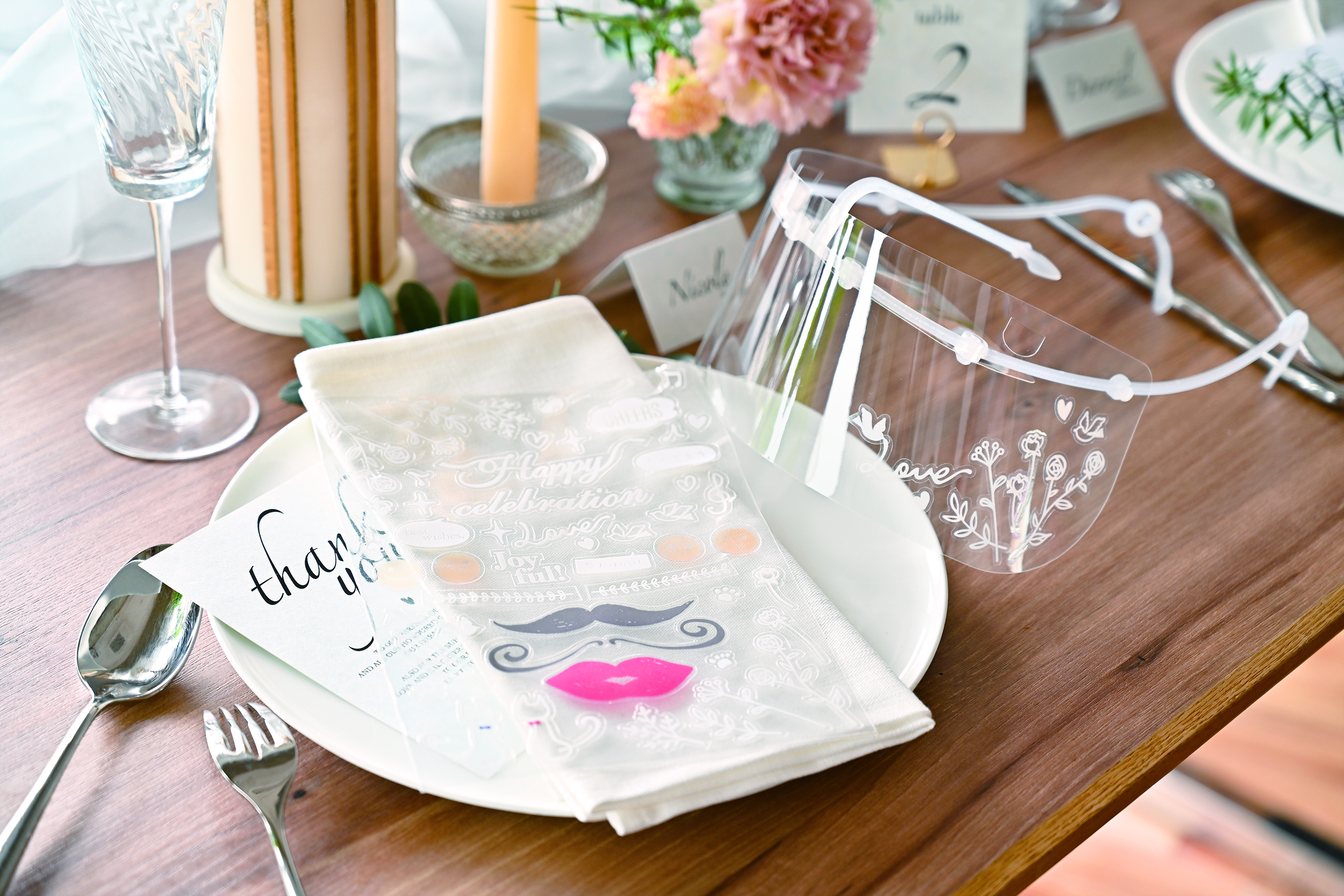 飲食店向けグラフィックツール制作のHiRASAWA(東京都新宿区)は4月20日、ブライダル専用のフェイスシールド【オイシールドW】を販売開始した。