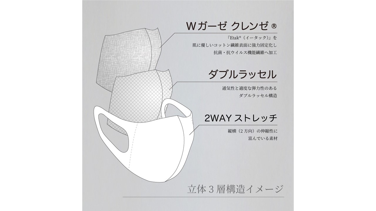 抗菌、抗ウイルス機能の繊維加工技術『クレンゼ』は、家庭洗濯50回後も繊維上の特定のウイルス数を99%以上削減するほか、増殖抑制も確認されている。『クレンゼマスク』は現在30万枚販売し、ホテル、結婚式場にも導入している。