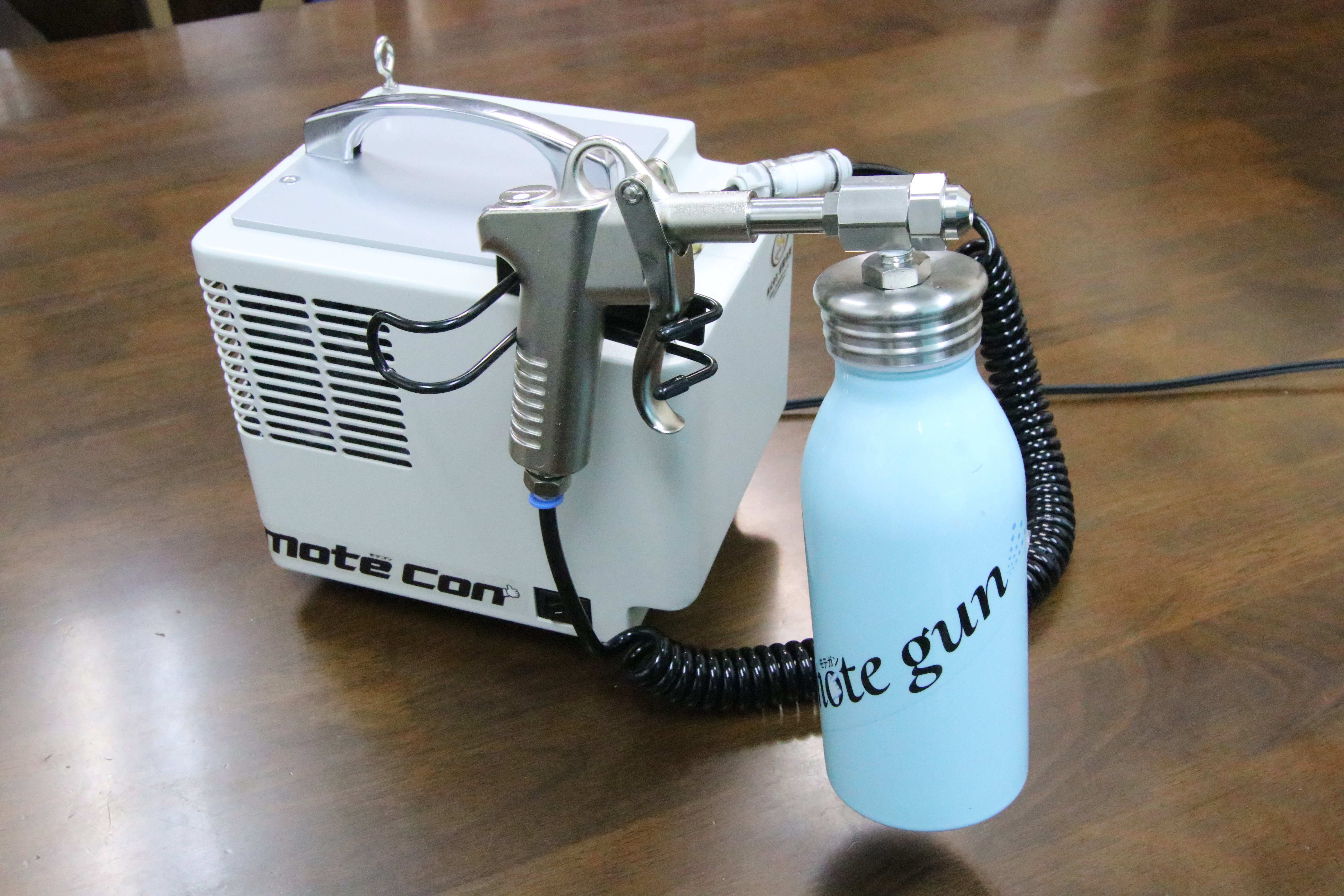 重さ約6キロの小型コンプレッサーに、取り付け式液体タンクと専用ノズル式ガンを装着。ガンのレバーを引くだけでタンクに入った除菌液を噴霧する。医療機関やホテル、幼稚園などで、施設内の除菌作業の効率化を図るために使われている。