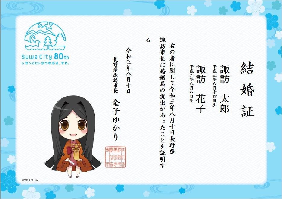2012年から同市役所職員の発案により、デザイン付きの証明書を発行。市公認キャラクター【諏訪姫】や諏訪湖の花火、霧ヶ峰などをデザインした9種の結婚証と4種の受理証明書を用意している。