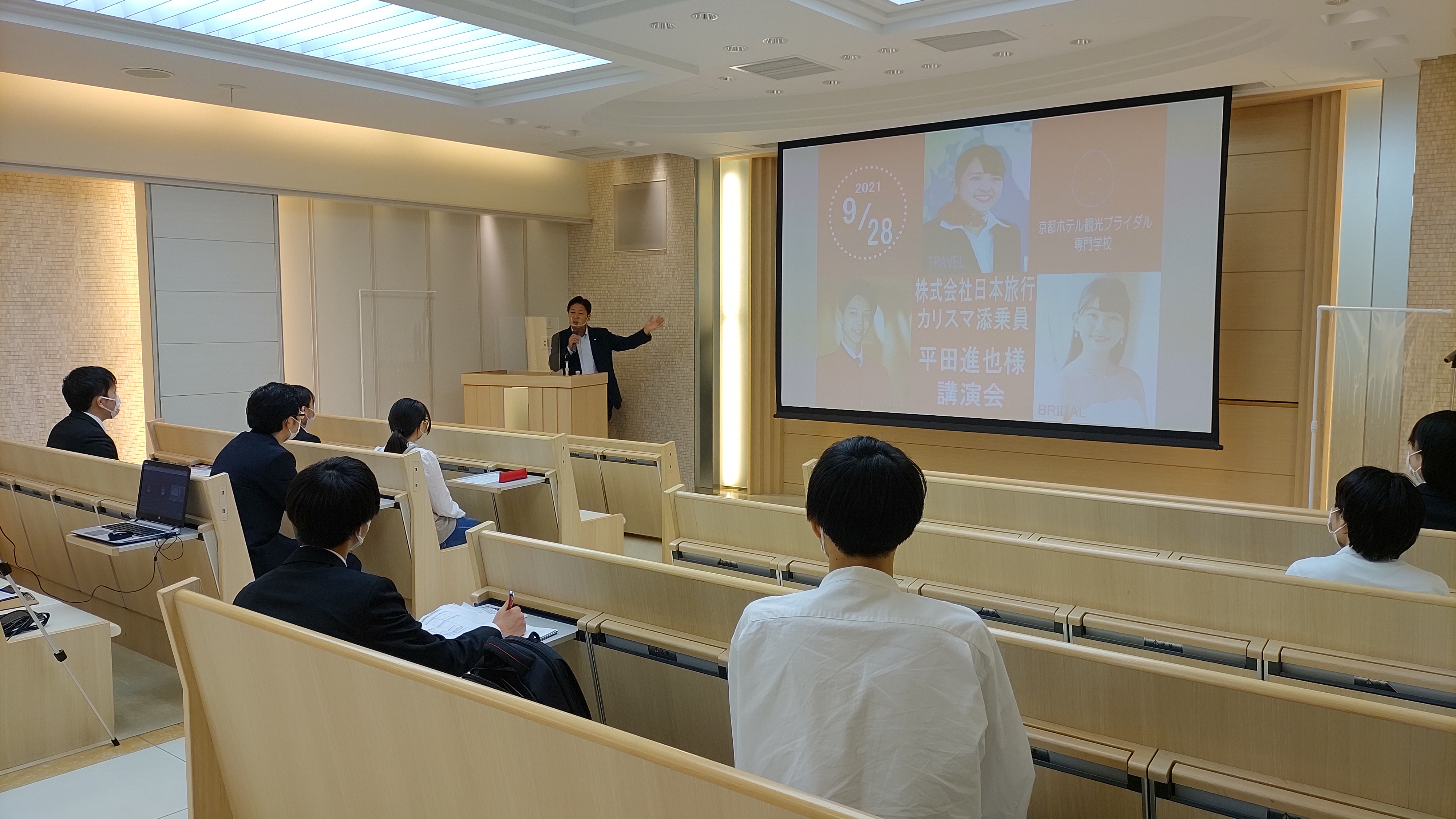 京都ホテル観光ブライダル専門学校(京都市中京区)は9月28日、旅行学科の1~2年生を対象に、日本旅行の添乗員・平田進也氏による講演会を開催した。