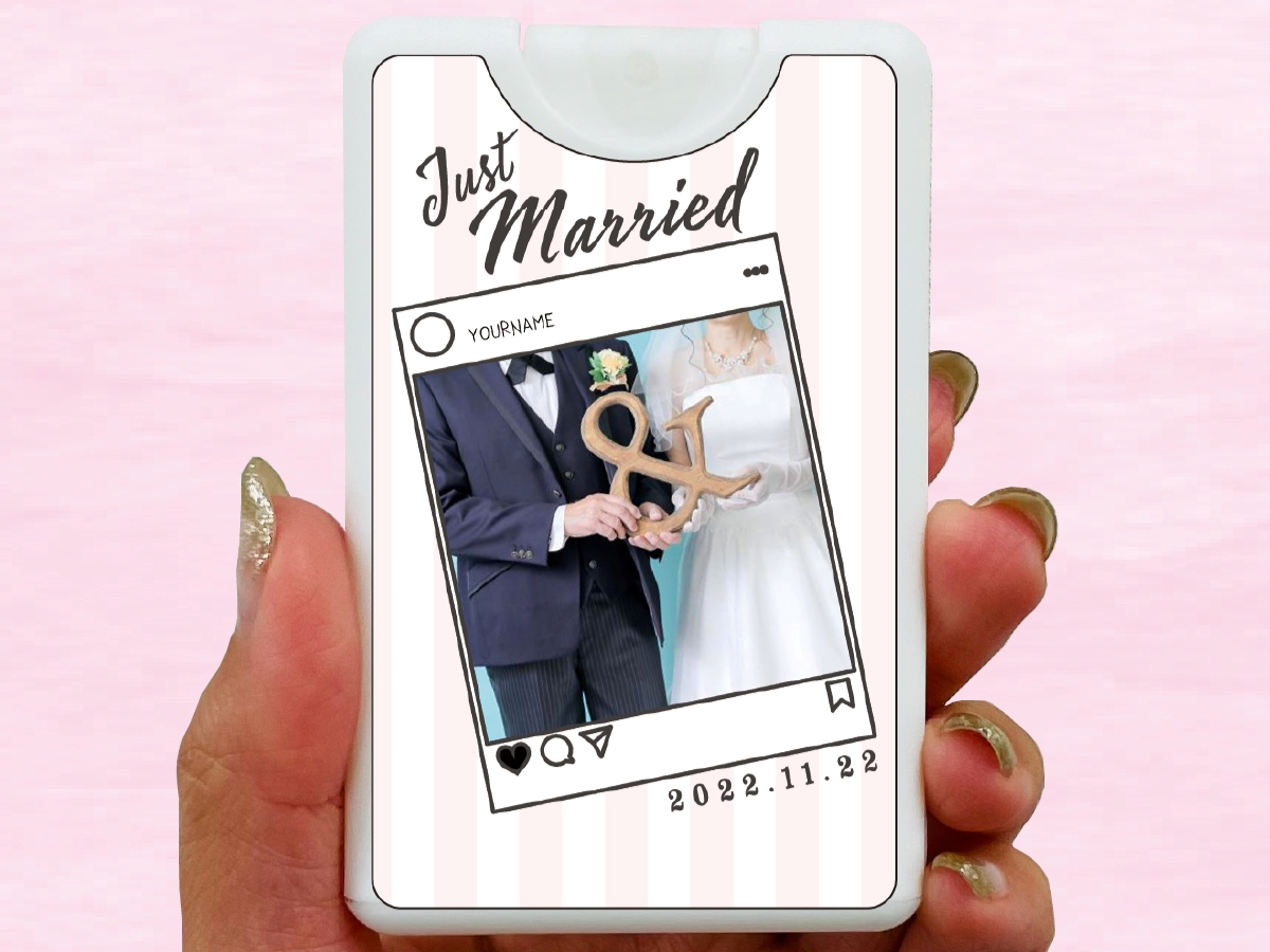 オリジナルでラベリングする、カード型除菌スプレー。前撮り写真を印刷したプチギフトや、企業のノベルティにも活用可能だ。価格は1 個550円。10個から注文を受け付け、ロット数に応じて割引も案内している。