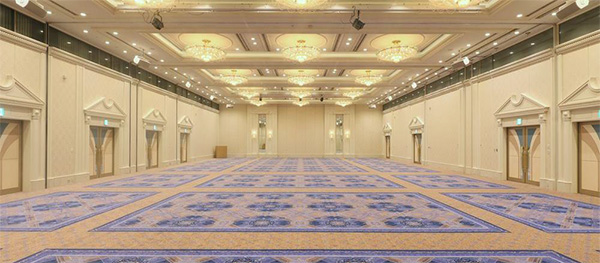 瀬戸内ならではの風景を意味する多島美(たとうび)の1 つ・蒲刈の渚がデザインコンセプト。穏やかな波や砂浜をイメージしたカーペットと、ダマスク織物柄の壁クロスを導入した。音響設備も一新。照明をLED化するなど、省エネで明るい空間に生まれ変わった。 皇城は広さ560㎡、天井高は6 mとなっている。