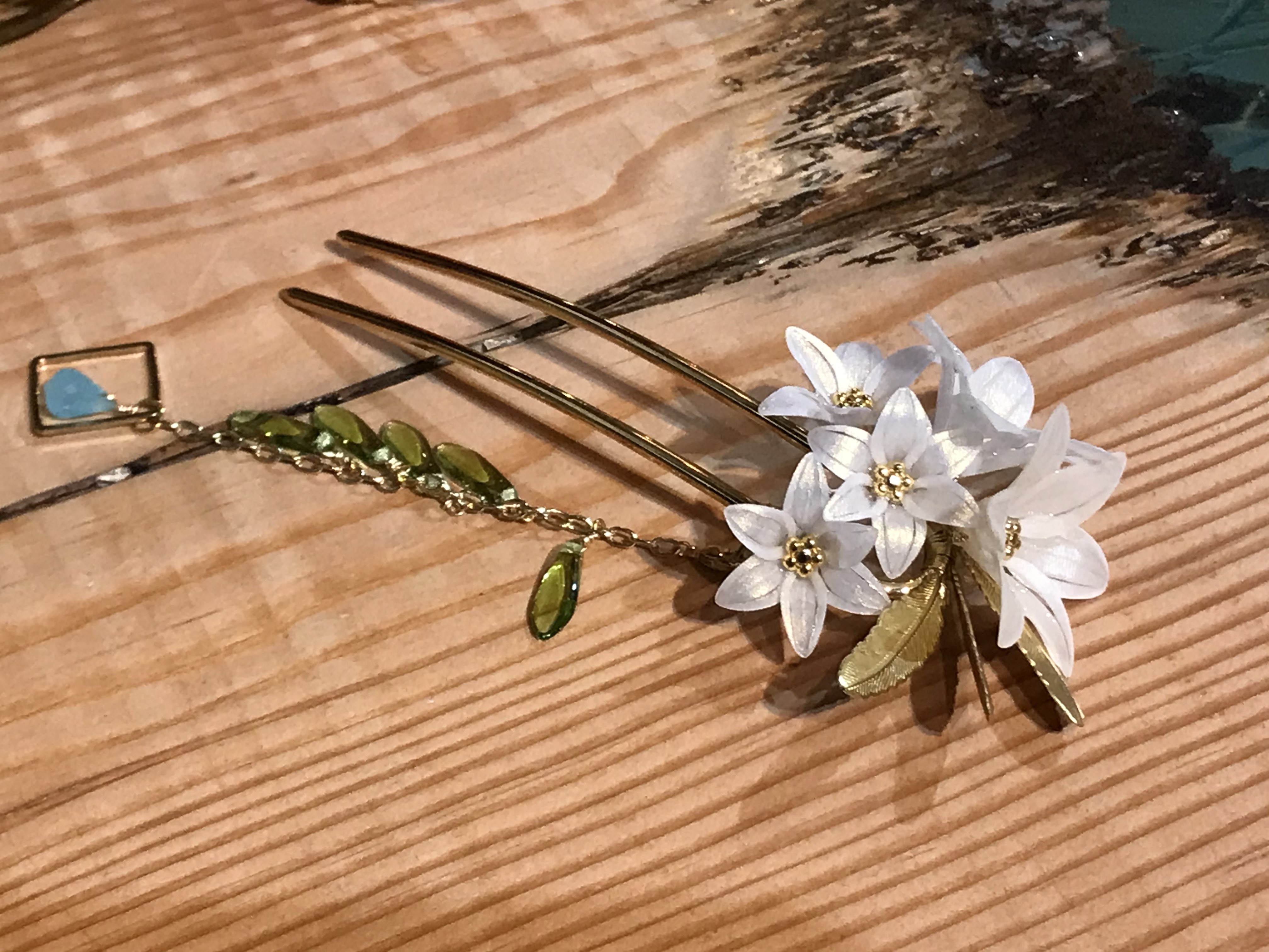 ピアス、かんざしのほか、ネックレスなど、花・蝶をモチーフとした作品を制作。ユリをイメージした簪はパール感のある紙で立体的に仕上げ、グリーンのビーズと合わせたデザイン。マットな仕上がりで、和洋どちらにも対応できるのが特徴。価格は2 万円。