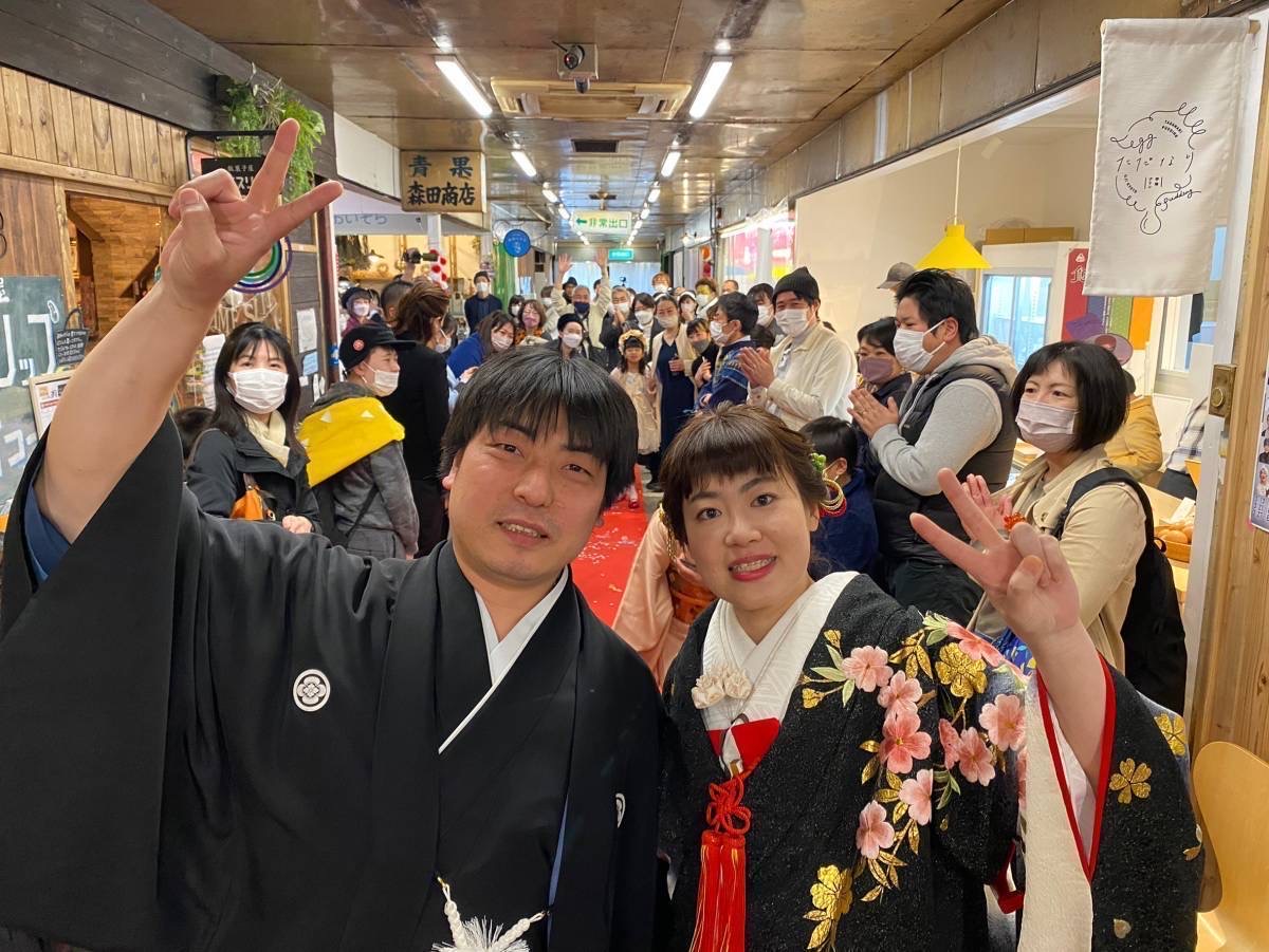 京都府宇治市にある町市場の大阪屋マーケットは3 月20日、【ICHIBA de Wedding】を開催した。館内全店舗が協力したほか、道行く人々もリボンシャワーに参加するなど、町全体で新郎新婦を祝福した。