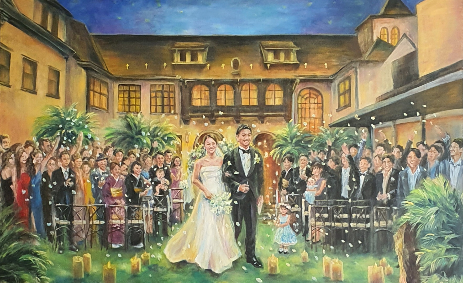 アメリカなど海外では、一般的なペインティングサービス。結婚式のワンシーンを切り取り、当日現場で絵を描いていく。速乾性の高いアクリル絵の具を使用し、背景から描き始める。新郎新婦のほか、希望に応じて家族やゲストなどもプラスできる。海外は1 日をかけてパーティーすることも多いが、日本の披露宴は3 時間弱。クオリティ維持のため作品は一旦アトリエに持ち帰り、仕上げ作業を施した後に納品する。