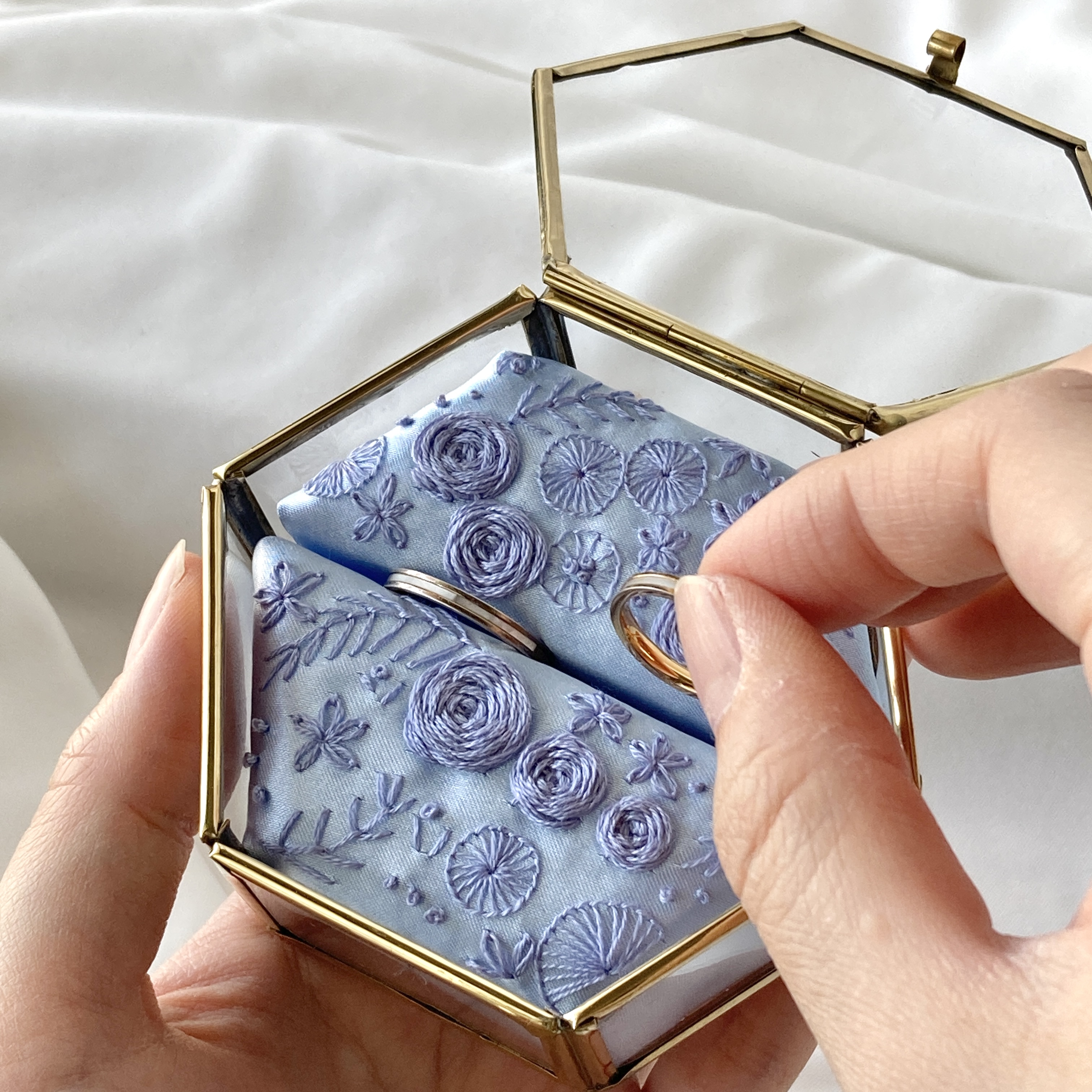 「欲しいリングピローが売っていない」との声を受け、製作を開始。デザインは60種類以上を展開し、ボックスは六角形とスクエアの2 タイプを用意している。