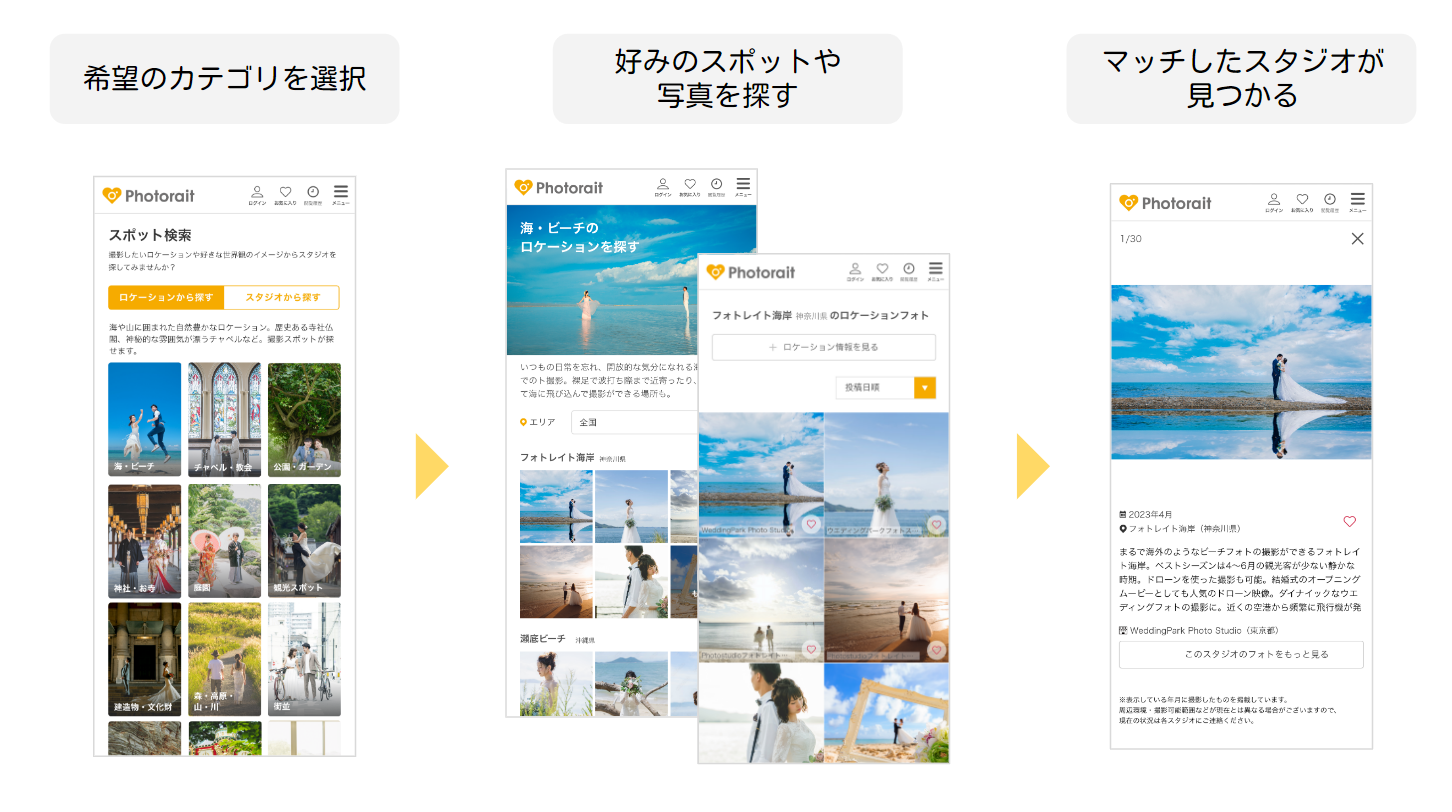 ウエディングパーク(東京都港区)の運営する写真のクチコミサイト『Photorait』は5 月31日、撮影場所や写真の雰囲気からスタジオを探せる【スポット検索】機能をリリースした。