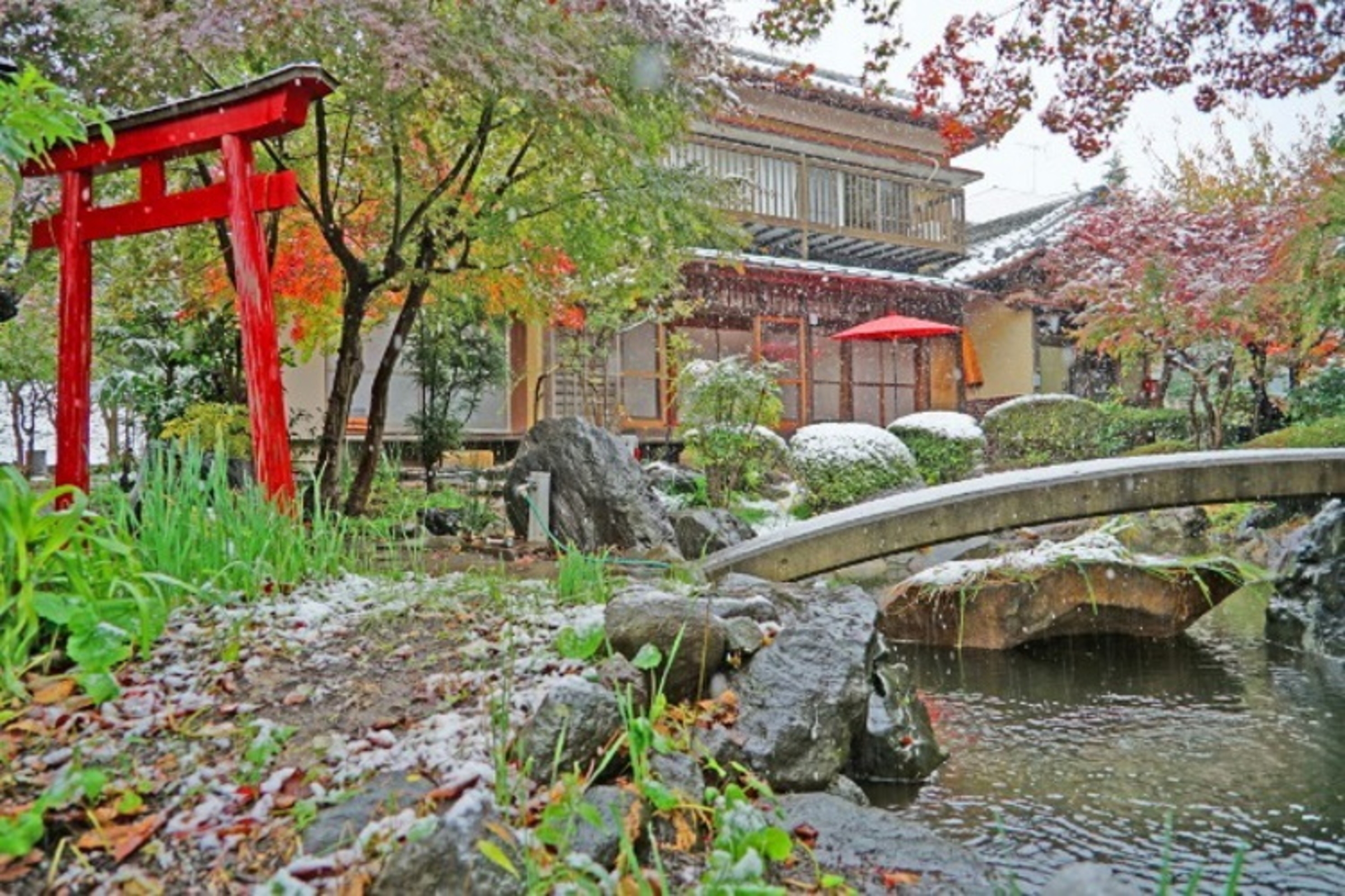 ドラマやCM、雑誌の撮影などでも多く使われている同施設。石橋、池、鳥居など広大な日本庭園が特徴で、昭和の時代を彷彿とさせる内装も含め和装に相応しい撮影スポットも多い。