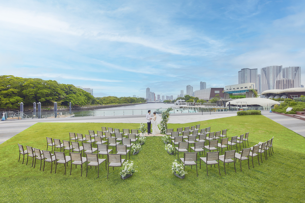 撮影ディレクションなどを展開するUNO DESIGN(東京都港区)のウエディングプロデュース事業『ARTERNO WEDDINGS(アルテルノウェディング)』は、昨年 6 月から『メズム東京、オートグラフ コレクション』のウエディングを担当している。6 月には、ホテルの位置するウォーターズ竹芝の芝生広場を使用した、『ガーデンセレモニープラン』を販売スタートした。