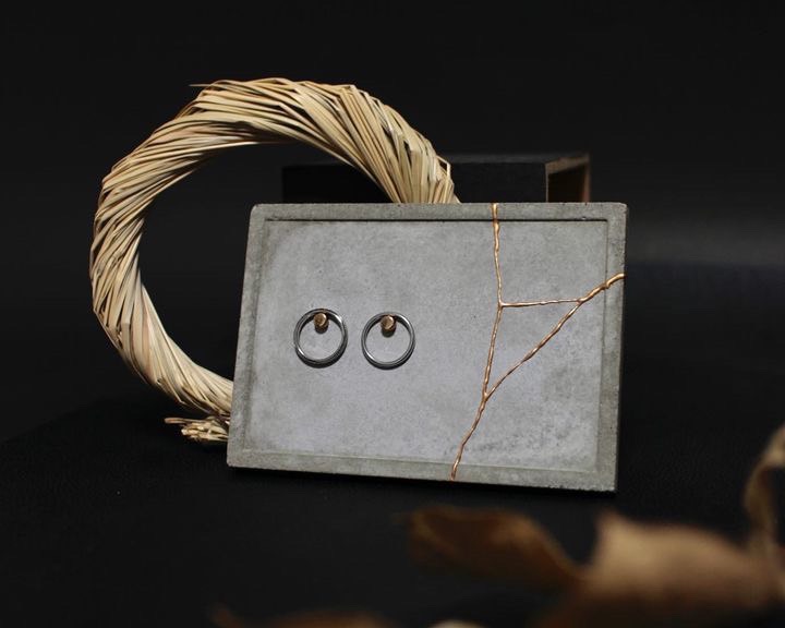 砂月(埼玉県所沢市)の金継ぎセメント作家・砂月氏は、2021年10月からセメントに金継ぎを施したリングピローやフラワーベース、アクセサリーなどを製作・販売している。