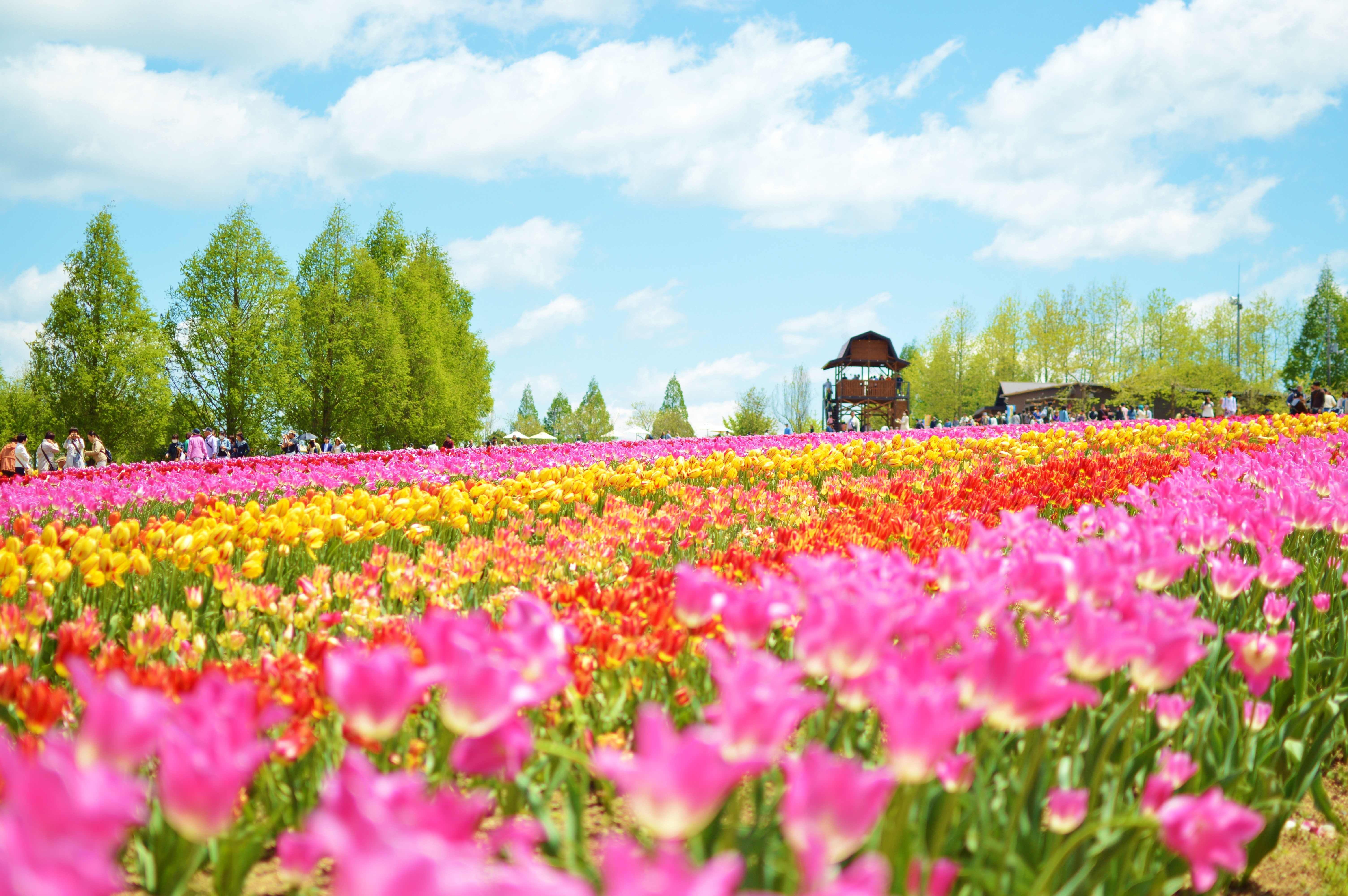 同社が手掛けているのは、世羅高原農場、Flower village花夢の里、そらの花畑 世羅高原花の森、せらふじ園。世羅高原農場は毎年春に『さくら祭り』を開催しており、3 万㎡の丘にしだれ桜と菜の花が咲き誇る。ヒヤシンスや雪柳など、春らしいカラフルな彩に溢れるのも特徴だ。