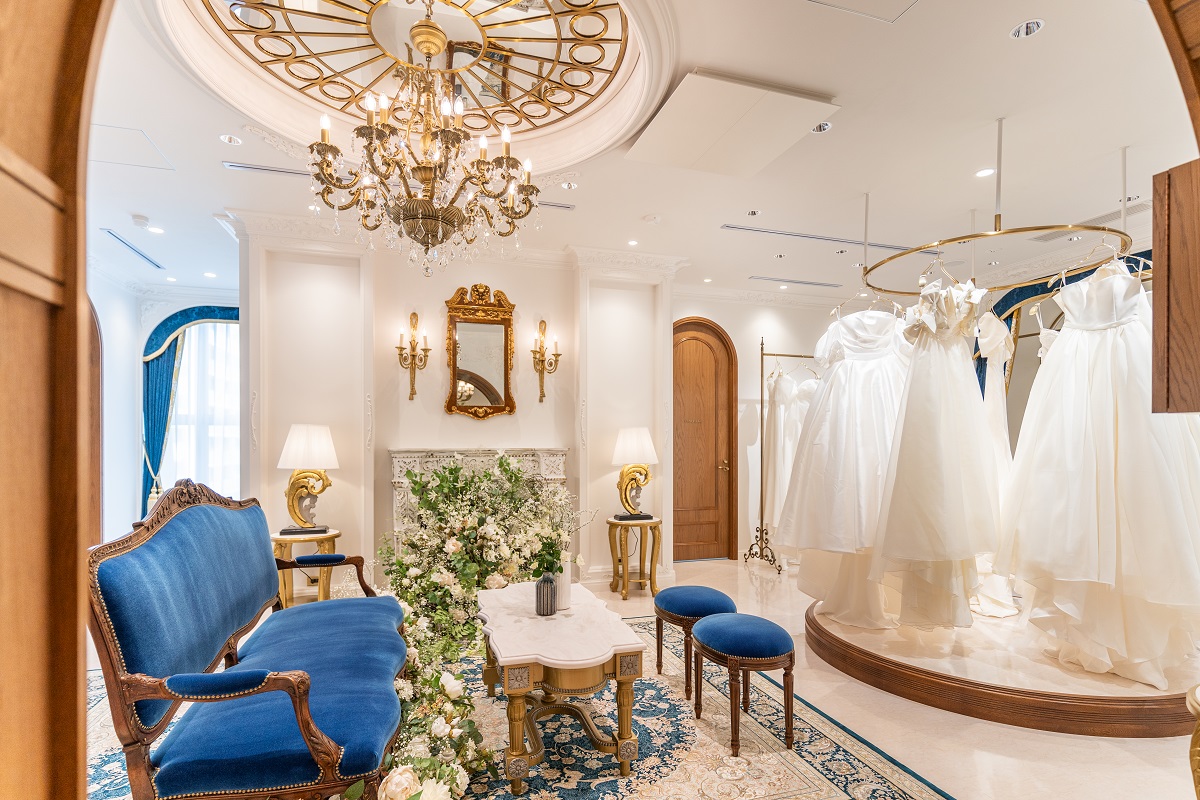 ブラス直営の同ドレスショップ。世界各地のアトリエからセレクトした、ドレス・関連アイテムを取り揃える。大阪店のインスピレーションの源は、世界中の最高級ホテル。ニューヨーク、ミラノ、パリなどをバイイングで巡った際、同ブランドプロデューサー・河合美憂氏がその目で見てきた数々のラグジュアリーホテルの華やかさなどを、大阪店に落とし込んだ。シャンデリアはフランスから取り寄せたほか、特注インテリアも配置。曲線美が印象的な内装デザインとなっている。
