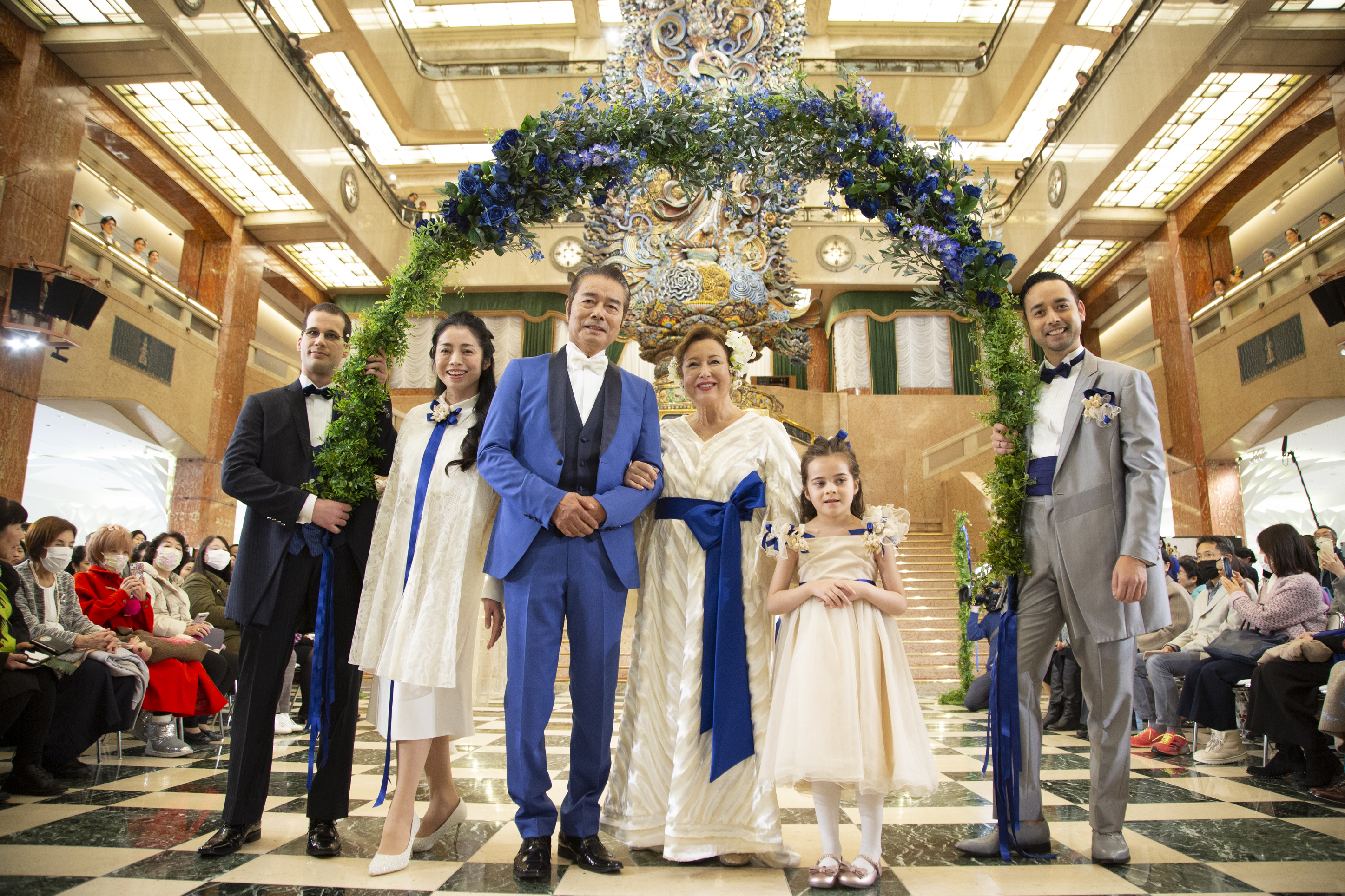 ユミカツラインターナショナル(東京都港区)は2 月12日、日本橋三越本店で勝野洋さんとキャシー中島さんの、結婚45周年を記念した『サファイアウエディング』を実施した。