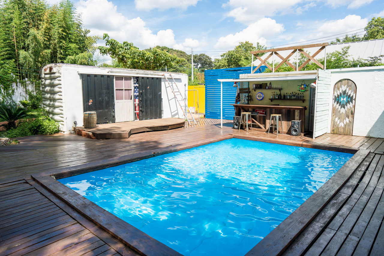 広さは250坪。アメリカ西海岸をテーマとし、貸切プライベートプール、キャンピングカー、ガレージ、オールドカーなどを併設している。