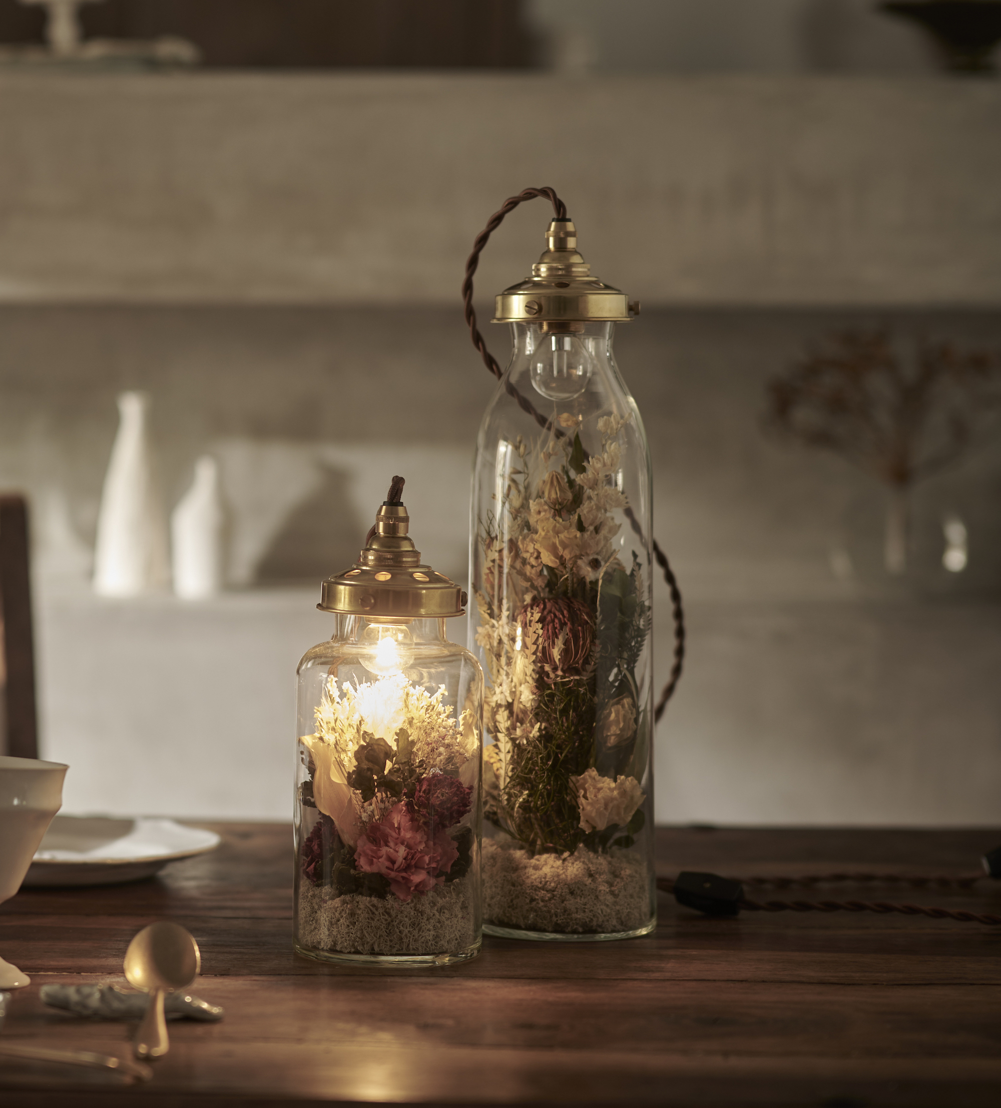 フラワーアクセサリーなどを制作・販売するm.soeur(京都市中京区)は、式当日のブーケや会場装花を活用し、照明器具にする【Wedding Bottle Light】を展開している。