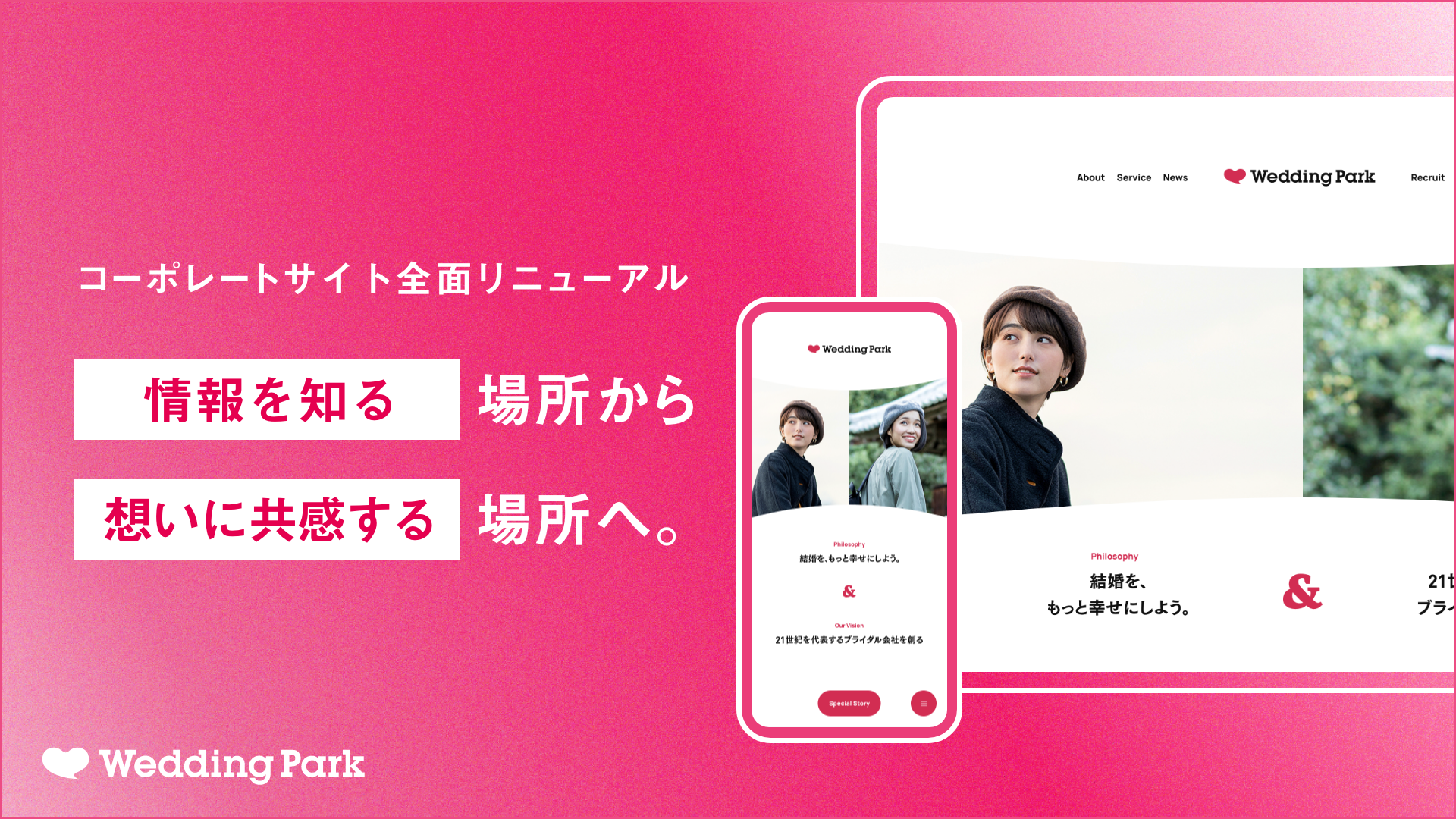 ウエディングパーク(東京都港区)は4 月18日、コーポレートサイトを全面リニューアルした。会社の情報を知る場所から、『想いに共感する場所』にリデザインしている。