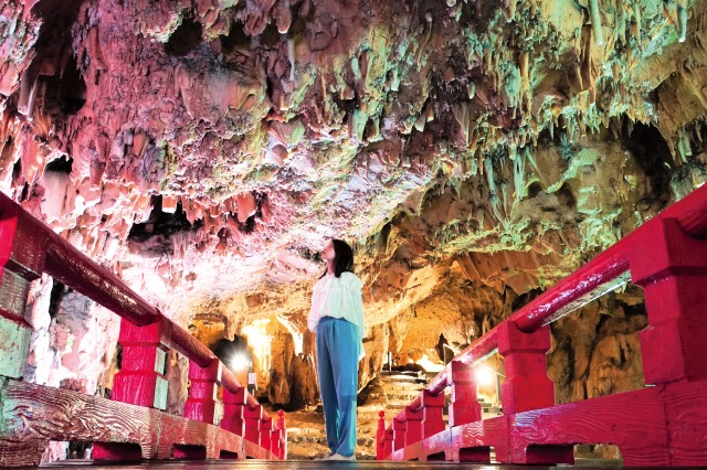 照明が彩る非日常感ある鍾乳洞【満奇洞】