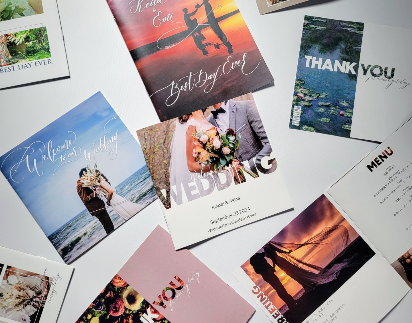 主力商品は『プロフィールブック』と『ウェルカムボード』。どちらも写真の雰囲気に合わせ、デジタルでカリグラフィーの文字入れをした、オリジナルデザインを作れる。プロフィールブックは8 pか12pを選び、中身を自由にカスタマイズできる。サイズは長方形と正方形を用意しており、色やフォントの変更も可能。注文前に実際に手にとって紙質や印字を確認できるよう、サンプルの郵送にも対応している。1ヵ月の制作数は約15件。