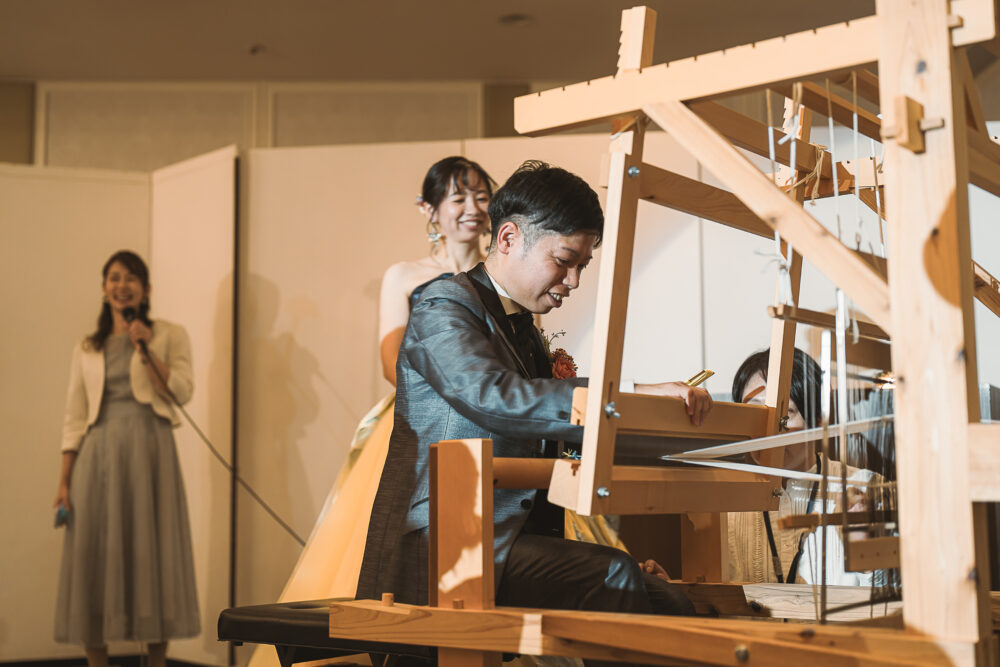 会場に持込まれた機織り機にはあらかじめ縦糸をセットし、希望するゲストが順番に織機を動かして、横糸を入れる作業を体験。約80人が参加した後、仕上げとして新郎新婦による織り上げ。幅16cm、長さ70cmのタペストリーを作った。列席者に披露した。新郎は「大切な人たちが織ってくれ、思い出の品となった」と想いを伝えた。