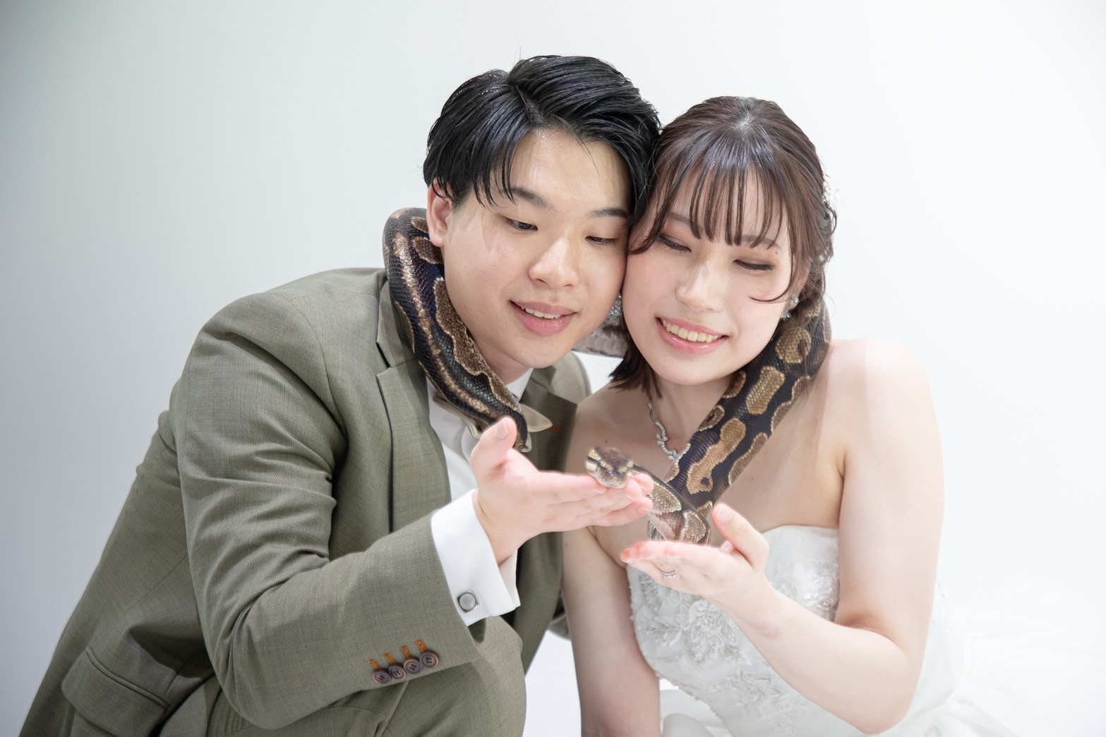 ワタベウェディング(京都市上京区)は11月18日、来年の干支『巳』にちなんで、本物のへびと一緒に撮影できる【へびウェディングフォト】撮影会を、ワタベウェディング 表参道フラッグシップ(東京都港区)で開催した。