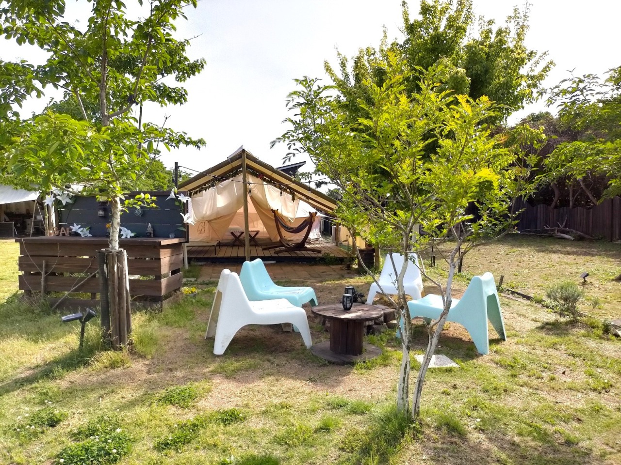 2016年にオープンしたグランピング施設。広さは400坪で、宿泊は8名まで対応している。1日1組限定で案内しており、友人とのウエディングパーティーでの利用も可能だ。敷地全体がドッグランとなっており、犬はリードを外して自由に動ける(大型犬も可)。日帰り利用では、愛犬家のオフ会としてのニーズもある。そのほか、バーベキュースペース、プールなどを併設している。