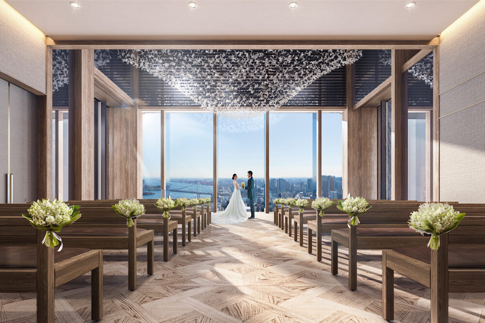 ウエディングのコンセプトは、『その一瞬が、レガシーになる』。43階に位置する『SKYチャペル』は、『咲き誇る瞬間』をコンセプトに、東京湾と都心のパノラマビューを特徴とする、自然光の降り注ぐ空間。150㎡の広さで、最大100名収容する。
