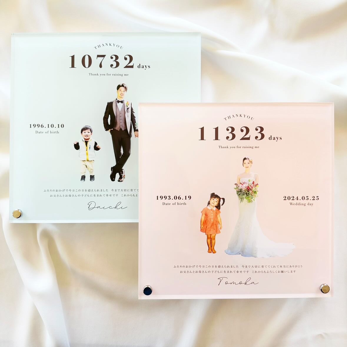 自身の結婚式をきっかけに、ブランドをスタート。人気商品は両親贈呈品の『子育て感謝状』で、幼少期と現在の写真、生まれた日、生まれてから挙式日までの日数、メッセージなどを入れられる。カラーは6 種類から選択可能。価格はアクリル正方形5500円〜。キャンバスタイプも展開し、人気のアイテムとなっている。