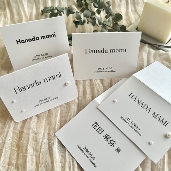 人気アイテムは『席札① 2 つ折り』。用紙はケント紙、エンボスペーパーから選択でき、8 種類のフォント、オプションのパールなどをセレクトして作れる。価格は1 枚80円〜。