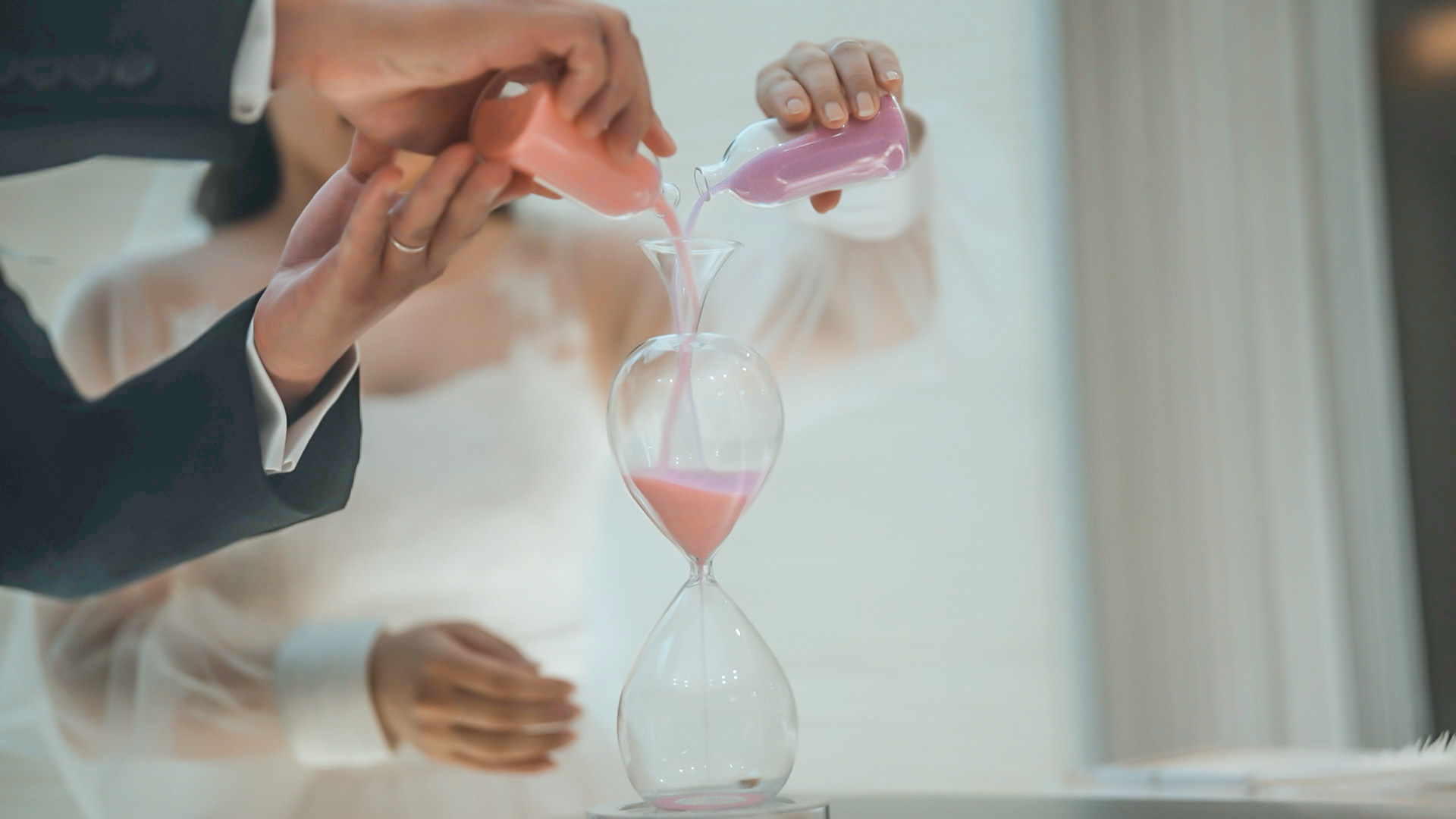その後、サックスのファンファーレと共に、砂時計グラスを持った新郎が入場。式中に2人が砂を注いで作成する砂時計は、サンドカラーの組合せで誓いを表現する。『月夜(青×黄)』は『あなたを愛しています』、『若葉(緑×黄)』は『初心と感謝を忘れずに』など、4通りを用意する。