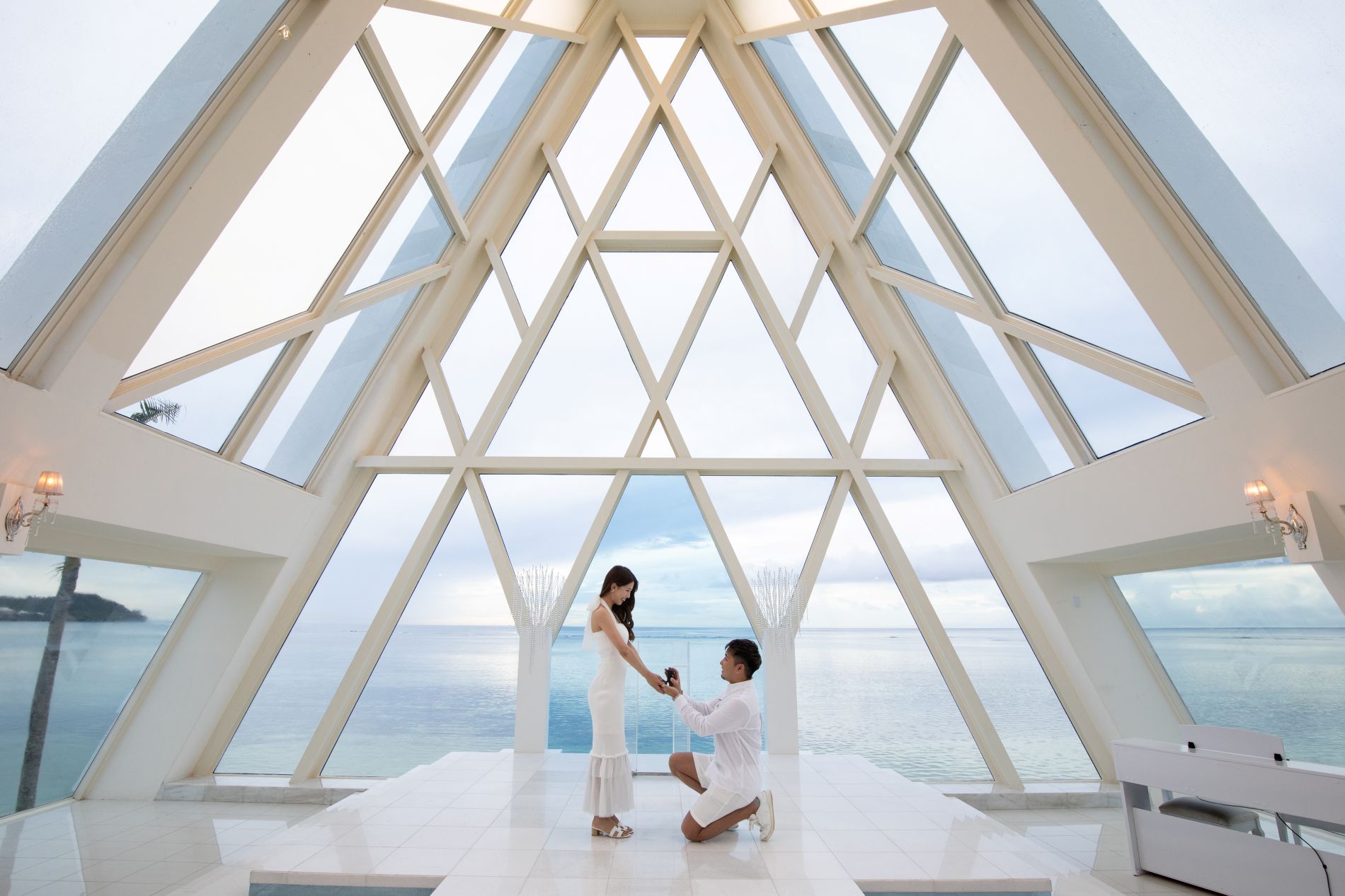 ワタベウェディング(京都市上京区)は7月29日、沖縄・恩納村のリゾートホテル『ANAインターコンチネンタル万座ビーチリゾート』内の『万座の教会』において、【チャペルでプロポーズプラン】を、リゾ婚・フォトウエディングのE Cサイト『EASY by WATABE WEDDING』限定で販売スタートした。
