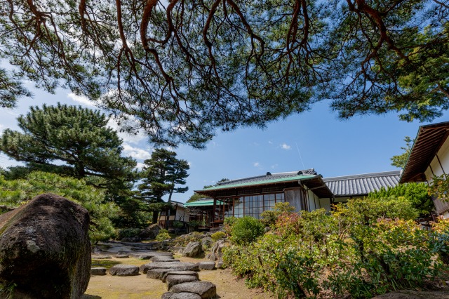 大正初期から昭和の初めにかけて造園。海から水を引いた池は、潮の干満に応じて水位が上下する潮入式池泉回遊庭園となっている。園内は松林が美しく繁り、大正時代の近代和風建築の主屋、茶室、浜座敷などを備える。2010年に文化庁より庭園は国指定の名勝に、建造物は重要文化財に指定を受けた。近年、県内では有数の前撮り撮影スポットとなっており、年間300件前後の実績を誇る。