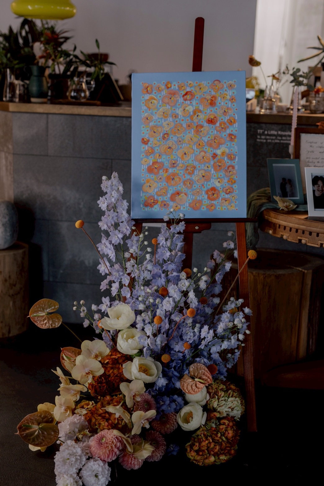 リアルな現実を描くのではなく、「どんなものにも細胞がある」との発想から描く。主力商品の『ウェルカムボード』は、はっきりした色味ではなく、式後もインテリアとして飾れるような馴染む色使いとオリジナルデザインで作成する。色味やモチーフのみカップルへヒアリングし、あえて納品時に初めて見てもらう流れ。
