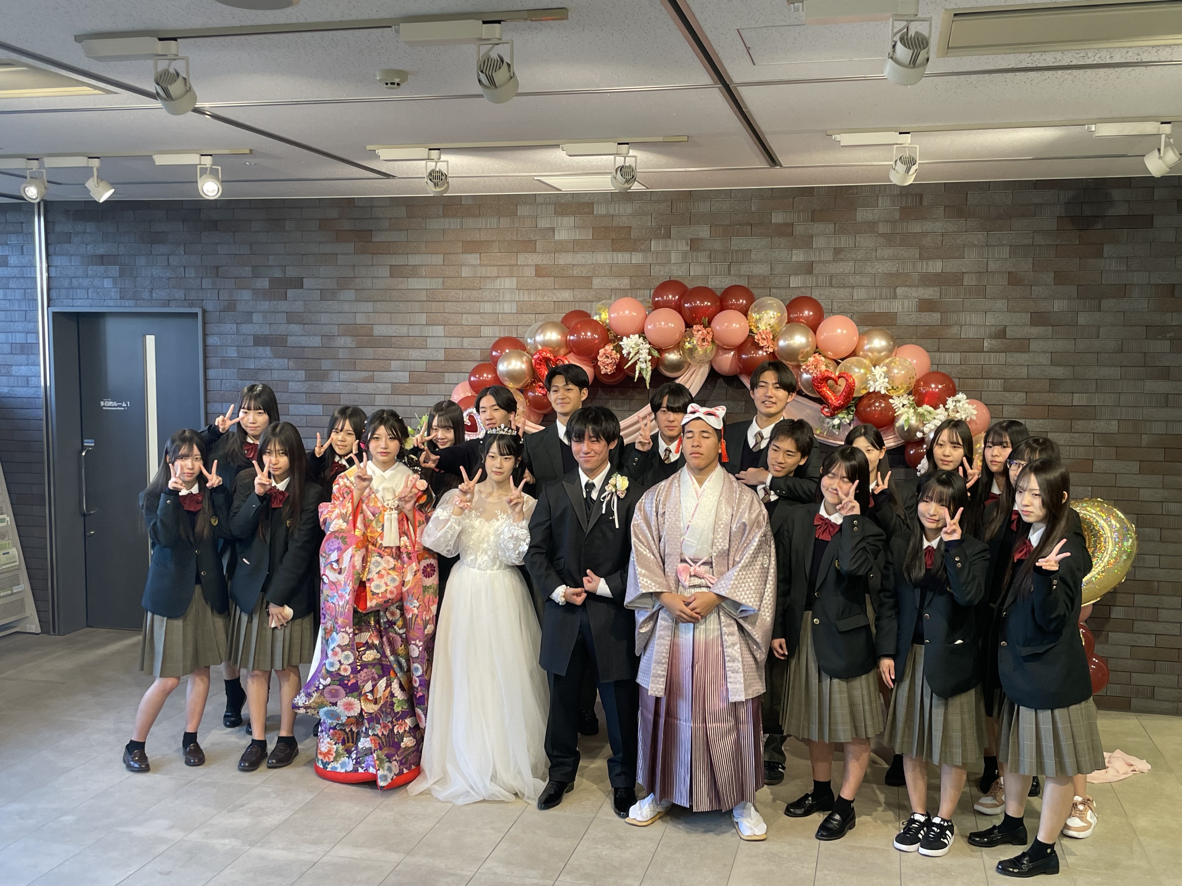 いい夫婦の日である当日は土曜日だったため、婚姻届受理に向けて市は臨時窓口を設置。届け出に訪れたカップルや保護者、教員などが見守る中、新郎新婦のモデルを務める生徒が和装・洋装姿で、2 パターンの模擬人前式を披露した。挙式にはブーケトス、シャボン玉演出などを盛り込んだ。同市ゆかりの民話『ごんぎつね』にちなんだ狐のお面や彼岸花の装飾で、半田らしさも表現した。